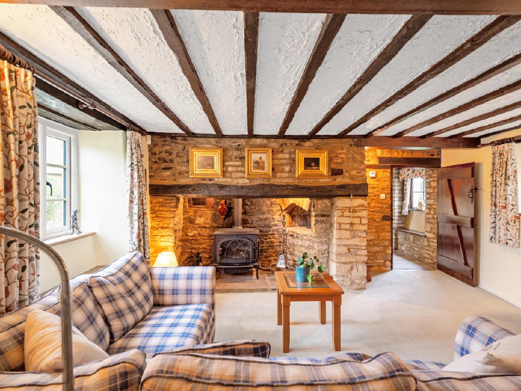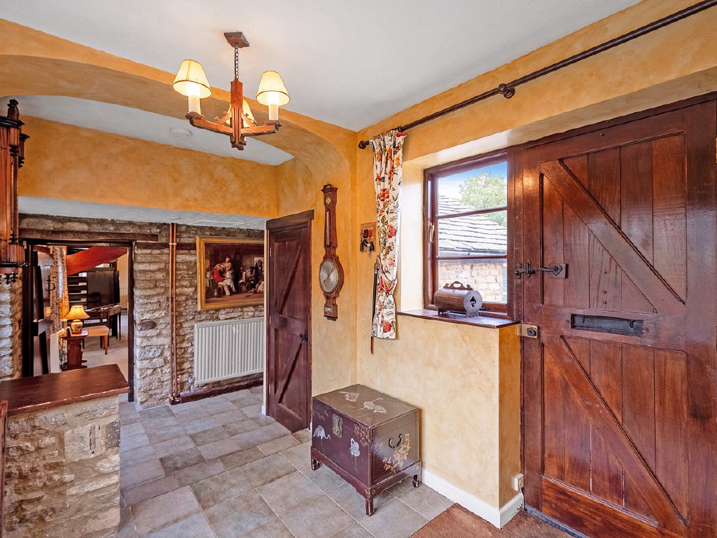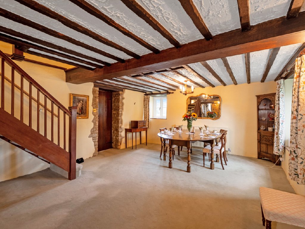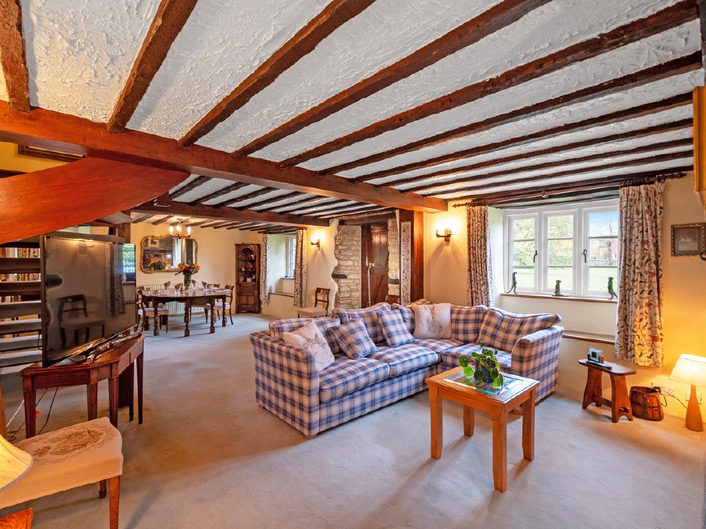 Stepping through the traditional ledge-and-brace front door, you’re welcomed by a broad and light-filled hallway that immediately sets the tone for the home’s relaxed character. To one side, the main living room stretches across the front of the cottage — once two rooms, now thoughtfully opened to form a spacious yet cosy setting. Exposed beams run overhead, window seats overlook the Green, and a magnificent Inglenook fireplace with a wood-burning stove and original bread oven creates an inviting focal point.