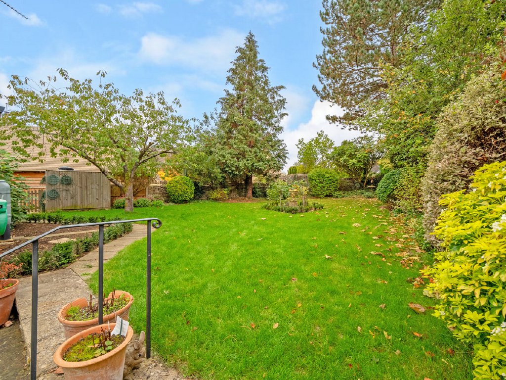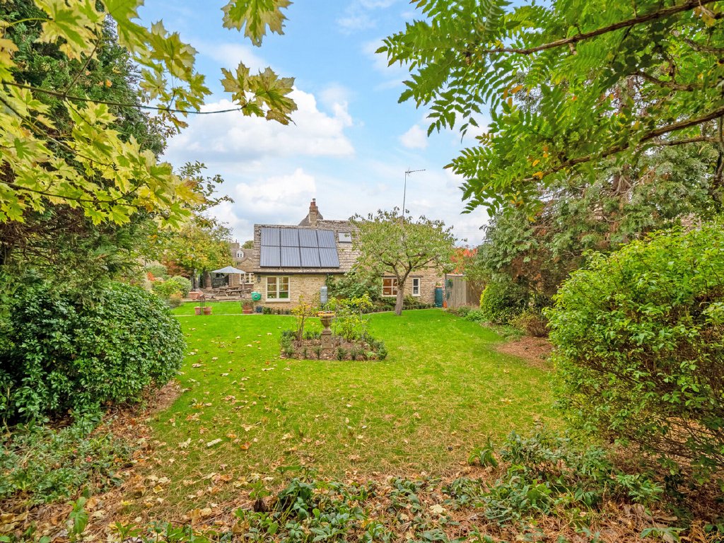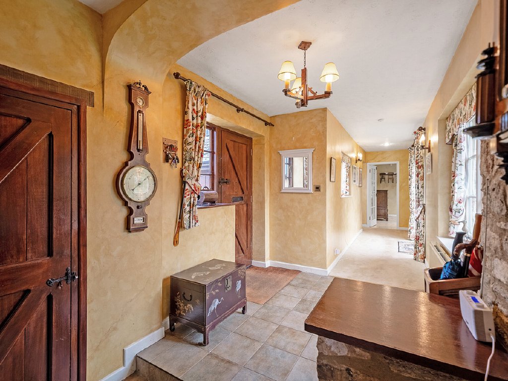 A large, level lawn stretches away from the house, framed by mature trees and borders that provide colour and privacy. A terrace just outside the kitchen is perfect for entertaining, while the surrounding stone walls and traditional features — including the old well — lend a sense of history and permanence.