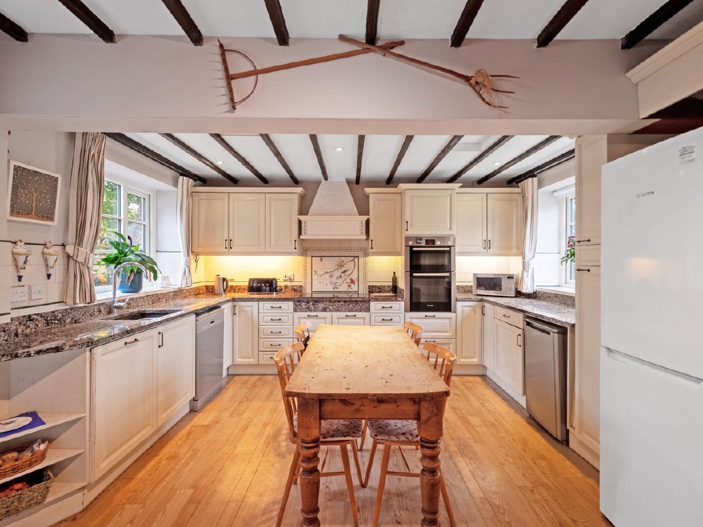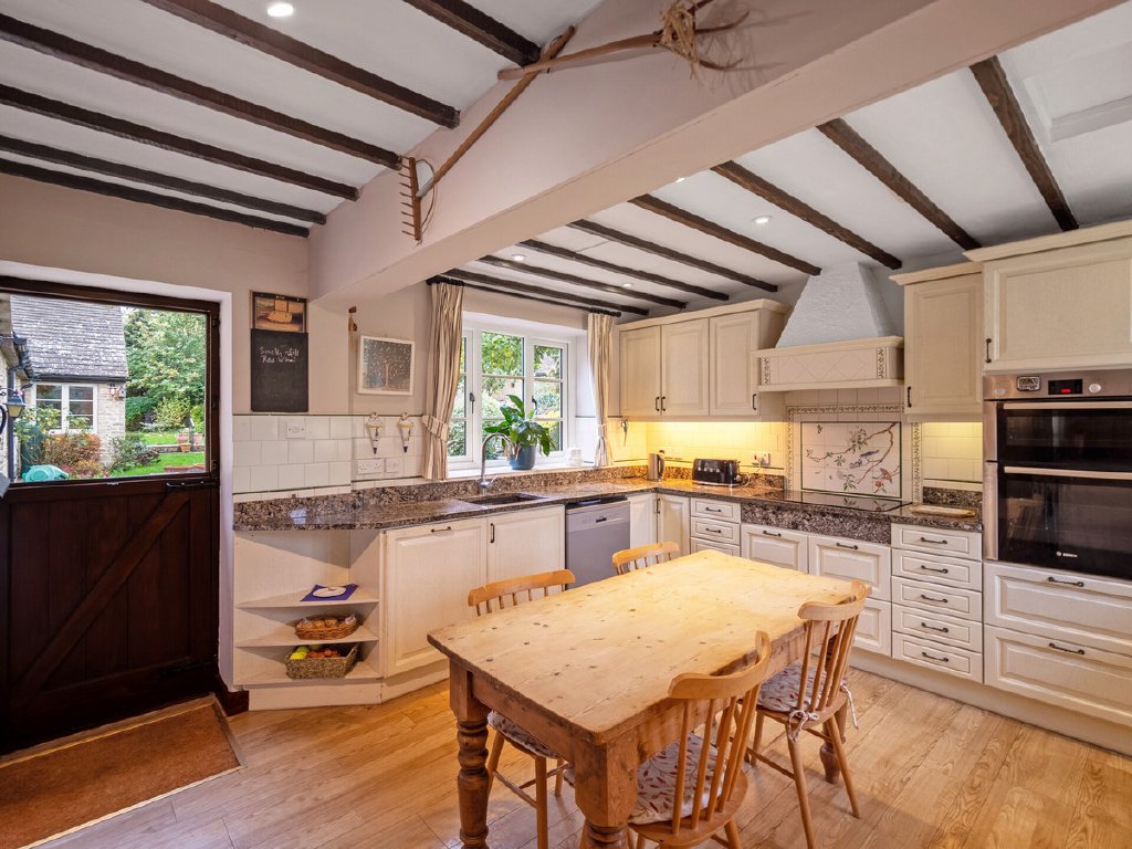 At the rear of the house, the kitchen is full of charm and natural light. Shaker-style cabinetry, granite worktops, and space for a farmhouse table create a homely, sociable feel. The stable door leads directly to the rear terrace, making the space perfect for informal dining or a quiet coffee in the morning sun.