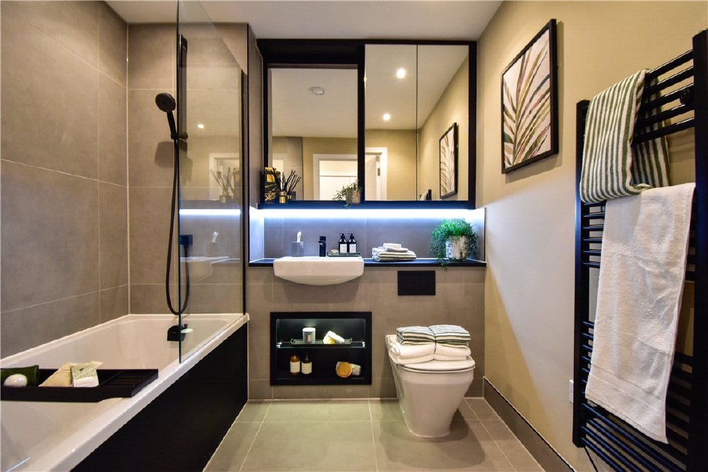 Of the hallway are two generous double bedrooms with built-in wardrobes and en-suite to principal, and a further bathroom with high-end finishes such as built-in cabinetry and LED lighting.