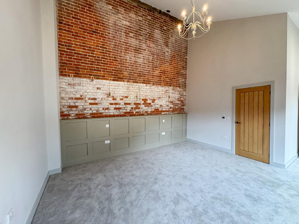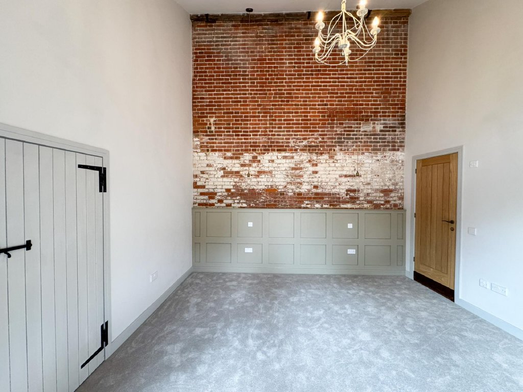 Another bedroom is accessed via a charming corridor with a front-facing window and a cloakroom tucked to the rear. Inside, the vaulted ceiling and brick feature wall create a cosy retreat, complete with a walk-in wardrobe and an en-suite that includes a walk-in shower, floating basin, and toilet, all finished with stylish details.