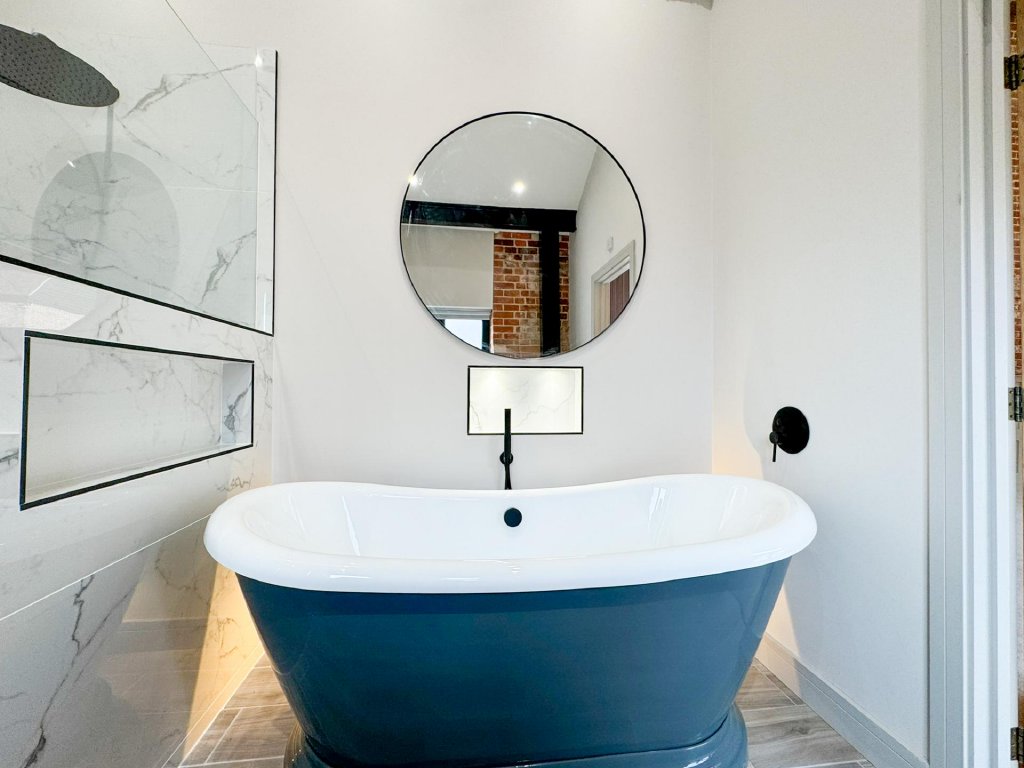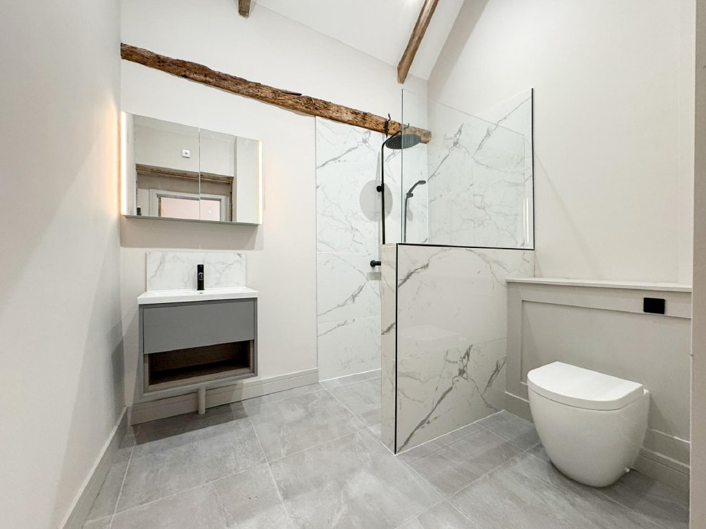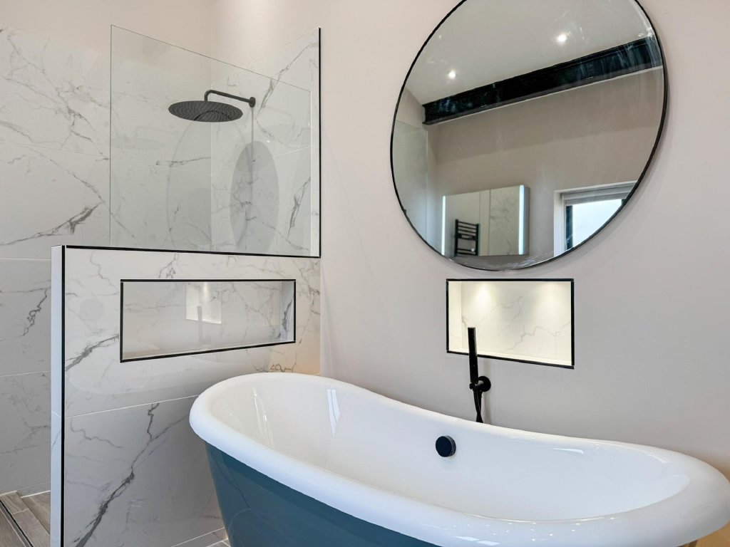 Another bedroom includes built-in storage and a wardrobe, with an en-suite that showcases a freestanding bath, walk-in rainfall shower, and a sleek vanity unit. The design combines tiled surfaces with soft lighting for a spa-like feel.