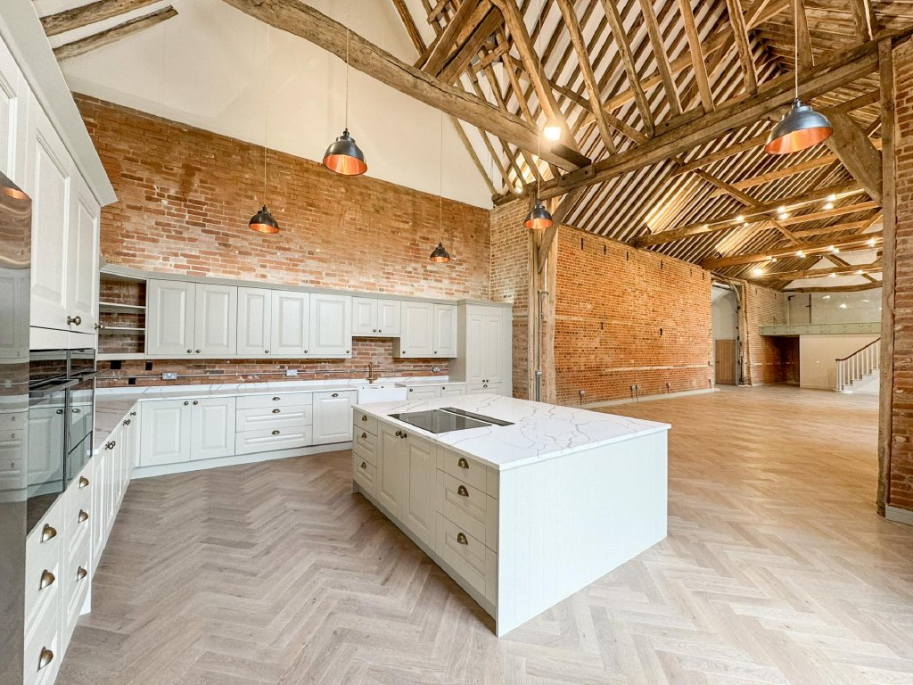 The heart of the home is a dramatic open-plan living area, where soaring ceilings and exposed beams evoke the charm of a converted barn, balanced with sleek, modern finishes. Rich herringbone wood flooring runs throughout, adding warmth and continuity.