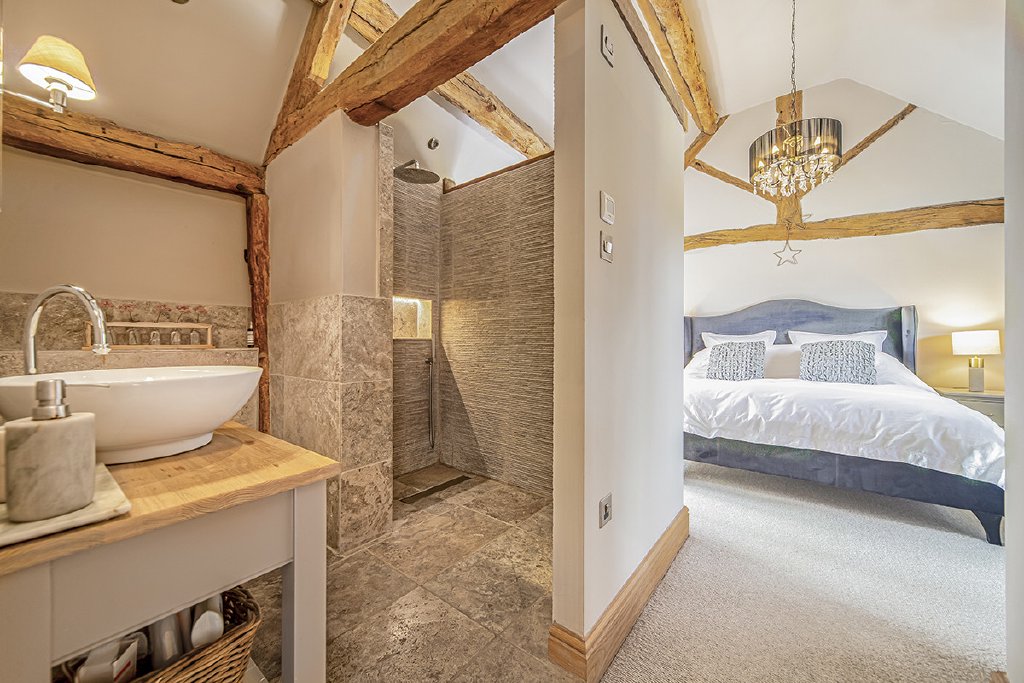 The main bedroom suite feels like a private retreat, its vaulted ceiling and exposed beams softened by tranquil Farrow & Ball tones. The ensuite features underfloor heating and a walk-in drencher shower, adding a touch of everyday luxury.