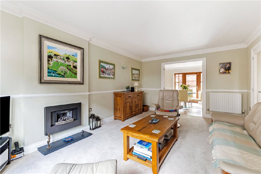 The welcoming entrance hall sets the tone for this fabulous home, off which the main reception rooms are accessed. The sitting room, centred around the gas fireplace, overlooks the communal courtyard to the front and enjoys generous proportions, linking seamlessly through to the kitchen/dining area via double doors.