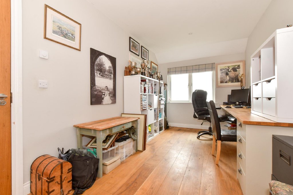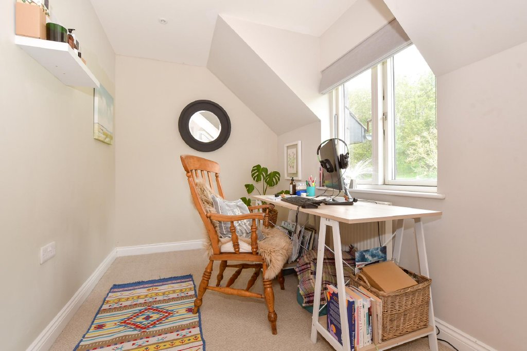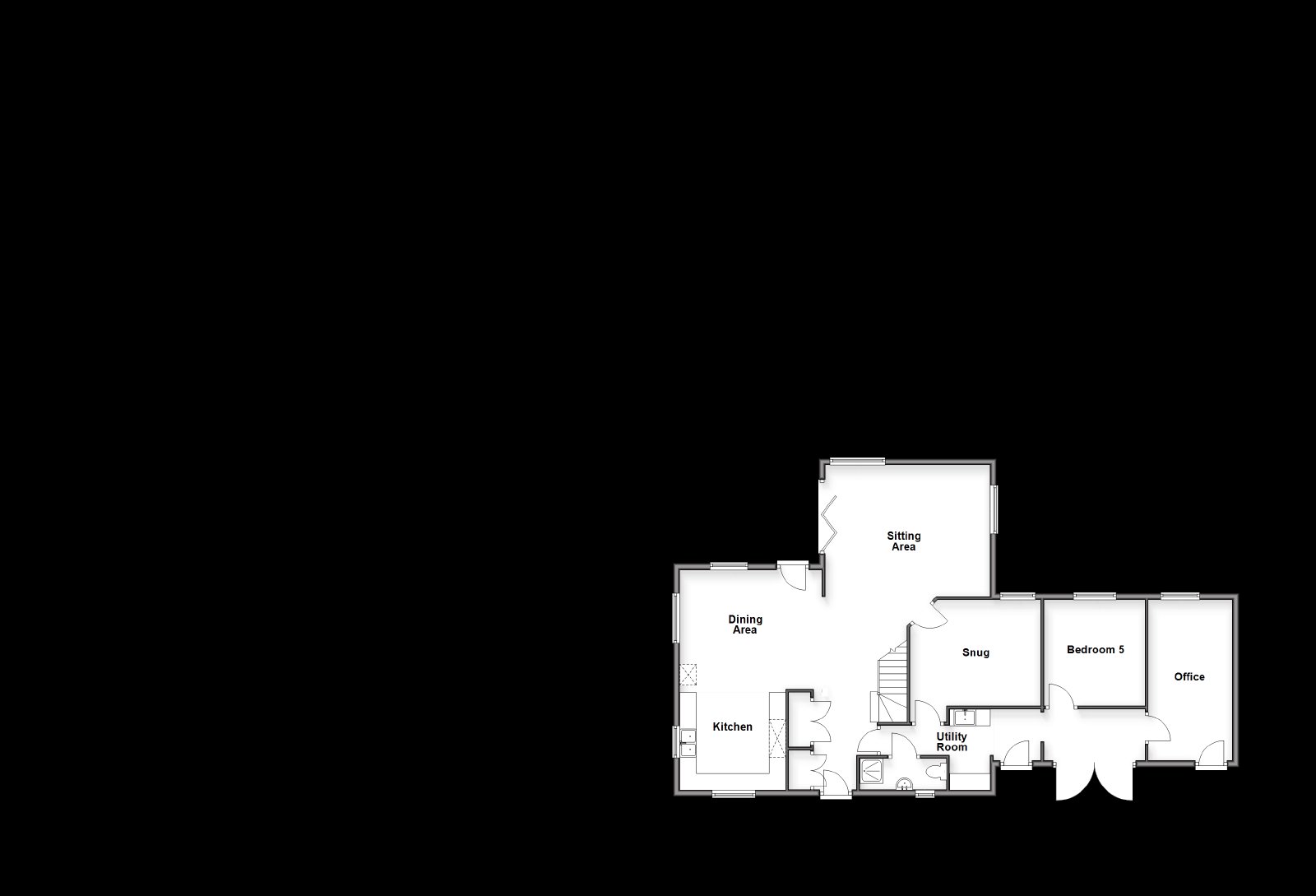Adjoining the kitchen is a spacious sitting area, also triple aspect, featuring a Charnwood wood-burning stove and triple bifold doors that open directly to the gardens, an inviting spot to unwind and enjoy the tranquillity of the setting. Beyond this, a cosy snug offers a flexible additional living space, currently used as a playroom, leading to a practical galley-style utility area and a useful wet room. This area also gives access to a ground-floor double bedroom and a large office, ideal for home working or providing potential as an annexe if required.