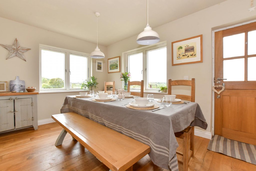 Inside, the sense of light and space is immediately apparent. A welcoming entrance hallway, with double storage cupboards, one housing the boiler, leads into an outstanding open-plan living area. Here, a dramatic floor-to-ceiling window frames the magnificent views, drawing the landscape indoors and creating a true heart to the home.