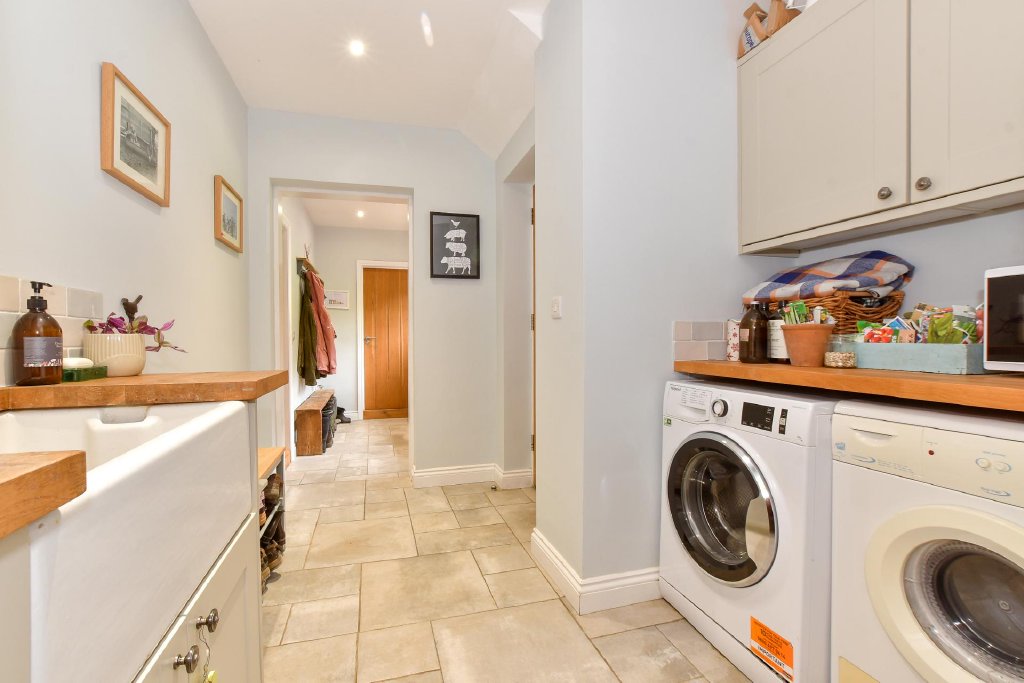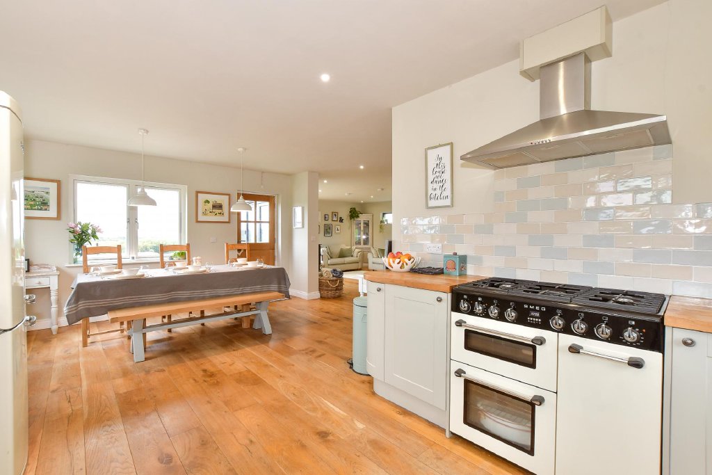 The country-style kitchen and dining space is a showcase of craftsmanship, fitted with cream cabinetry, contrasting wooden countertops, and a classic double butler sink. There is space for a large range-style cooker, an integral dishwasher, and a generous dining area perfect for family gatherings. Triple-aspect windows ensure the room is flooded with natural light throughout the day.