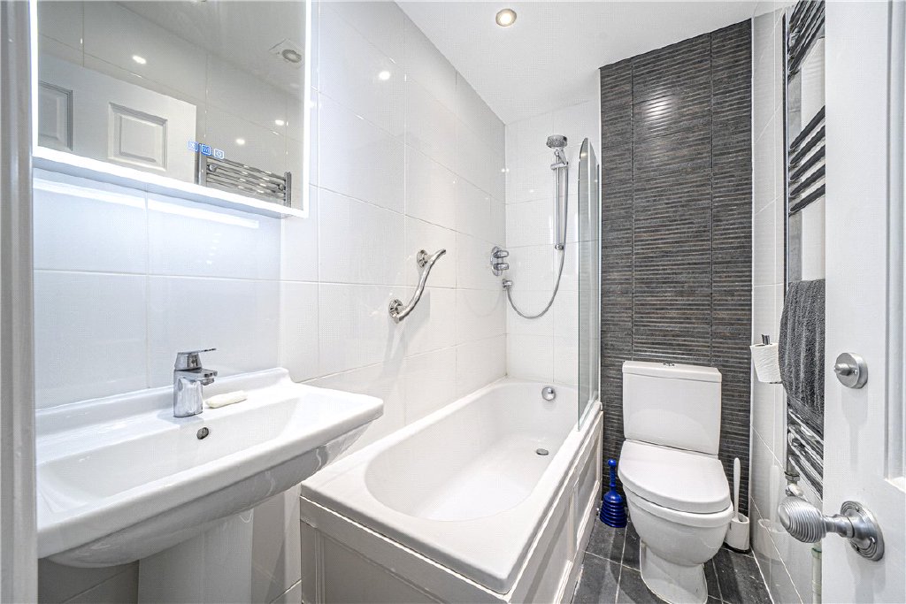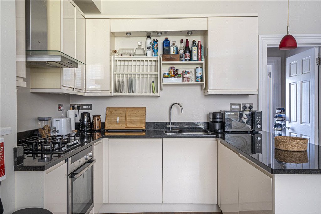 Forming part of a conversion in 2013, this one bedroom elevated ground floor apartment offers a perfect blend of modern convenience with period character features. Steps lead up to the front entrance, with secure entry system, this in turns opens to the ground floor hall with stairs and lift to all floors, a private external storage cupboard and private door to the light and spacious open plan sitting/dining/kitchen with high ceilings, central fireplace and surround and a mix of kitchen wall and base units with integrated appliances, door through to the inner hall with door through to the bathroom with mains pressure shower over the panel bath, low level WC and wash hand basin. The double bedroom is to the rear of building with full height window.