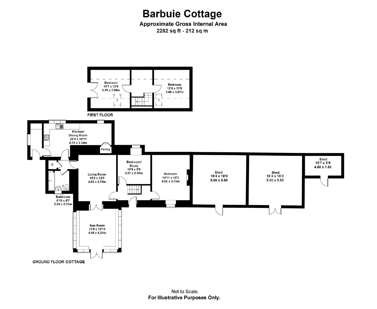 There are two well-proportioned double bedrooms on the ground floor, along with a bathroom comprising electric shower over the bath, WC and wash hand basin.