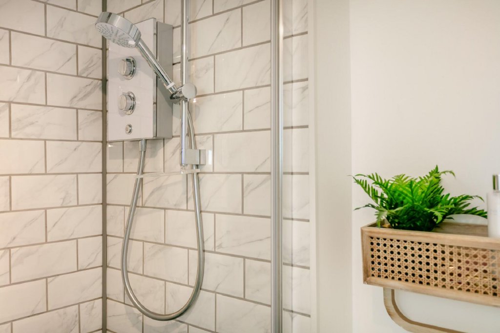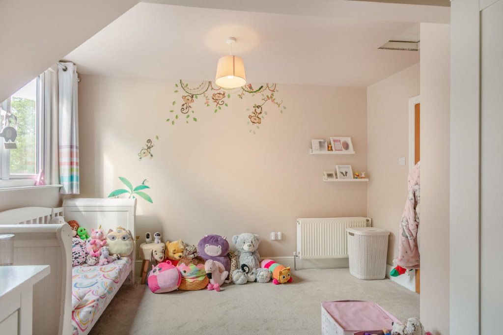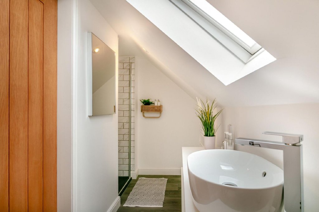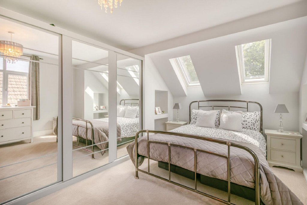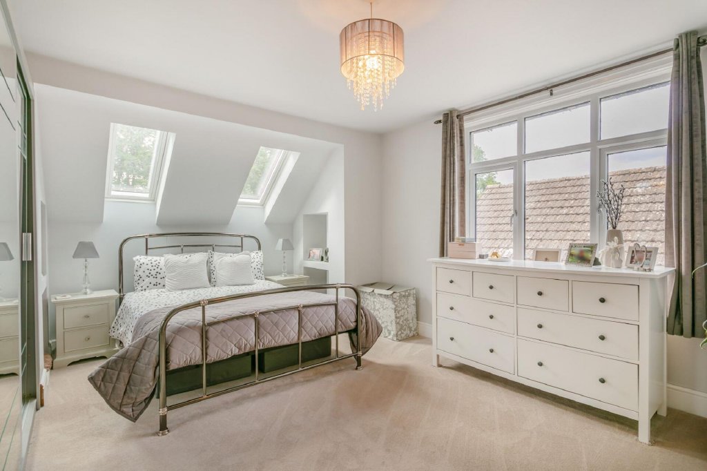 Located on the first-floor are three further bedrooms and the family bathroom. The attractive and spacious master bedroom enjoys natural light from its dual aspect, with two Velux windows positioned over the bed. There is a fantastic amount of storage with built in wardrobes and deep recessed shelving located either side of the bed. The en-suite is beautifully fitted with a glazed shower enclosure, countertop sink with storage below and a WC.