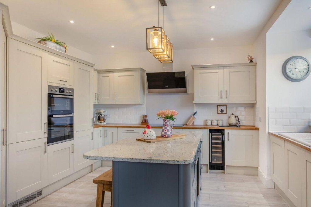 The kitchen is beautifully fitted with a large central island and an incredible amount of storage, with a large corner pantry. There are a range of integral appliances, including a dishwasher, hob, fridge, freezer, double oven and wine cooler.