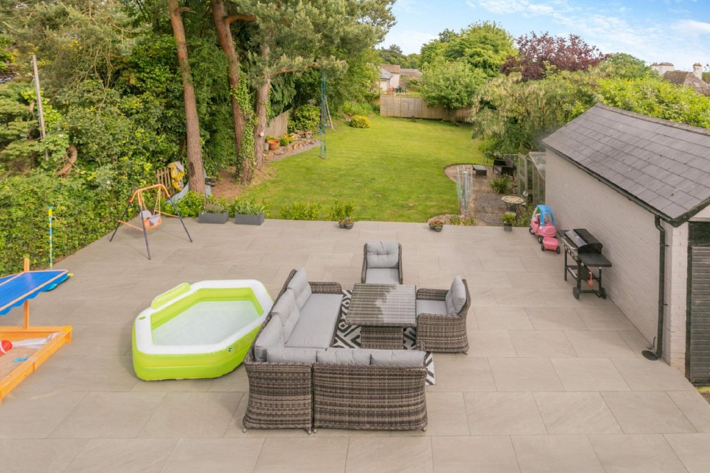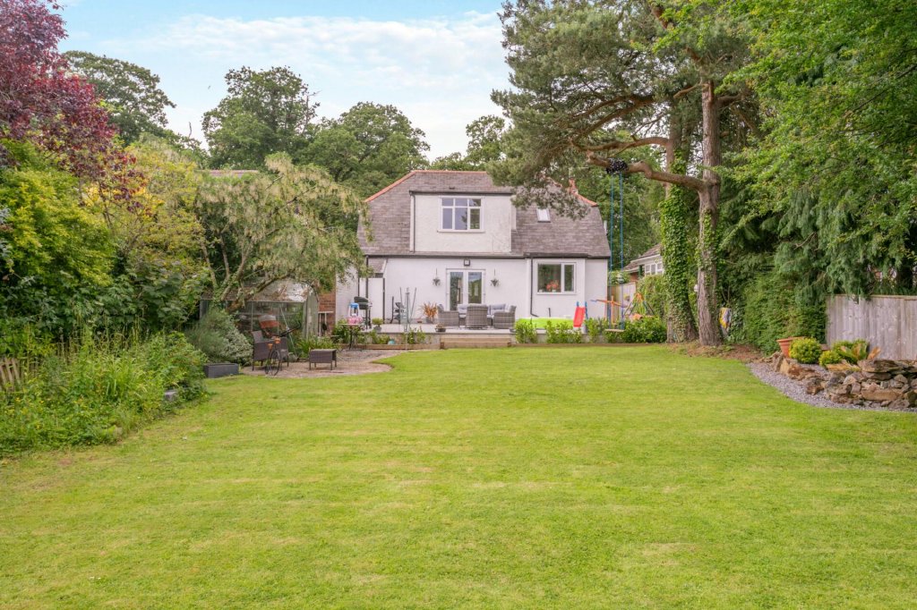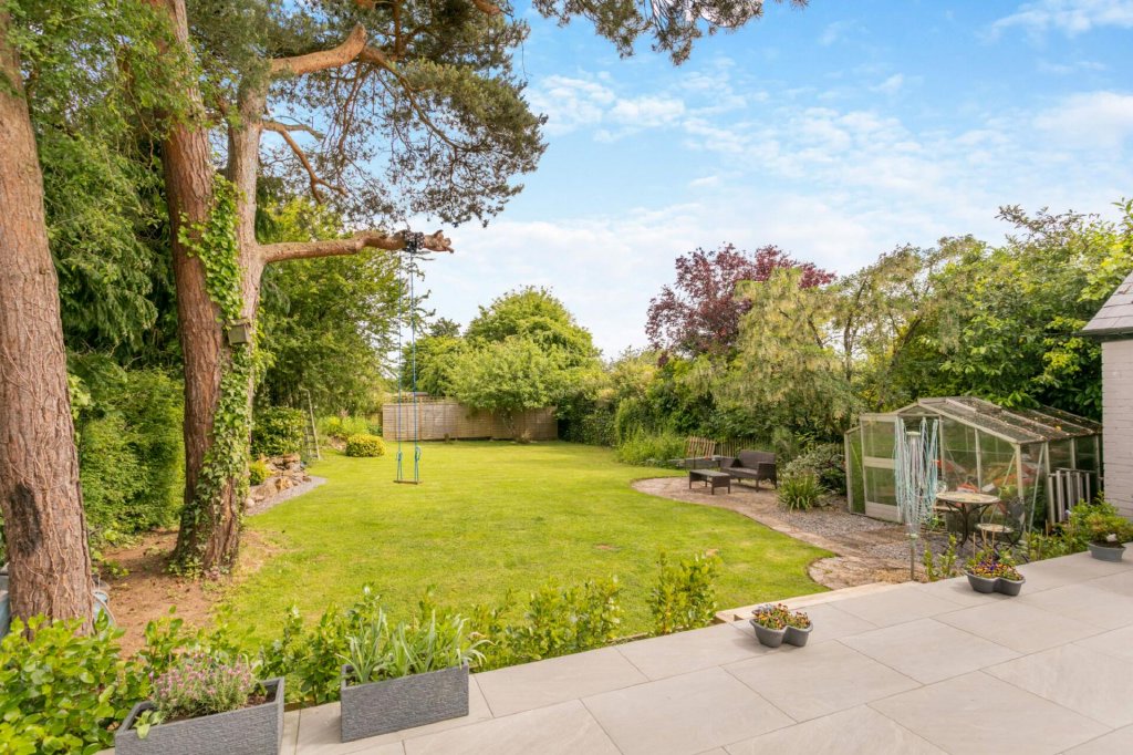 French doors open out onto an expansive south facing patio area with plenty of room for relaxing and entertaining. There are steps down to a large level lawn, bordered with pretty mature shrubs and trees. There is even further seating located on the lawn, on either side of the greenhouse.