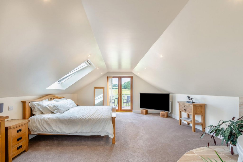 The staircase leads to the first floor landing, which has space for a cosy seating area and leads to the stunning master suite, which is luxurious in size and benefits from a large jacuzzi corner bath, a en-suite shower room and walk-in wardrobe and a and a walk in wardrobe. French doors open onto a large balcony which overlooks the paddocks and the surrounding countryside. The current owners enjoy the freedom and comfort of being able to watch over the horses and foals from the haven of this tranquil retreat.