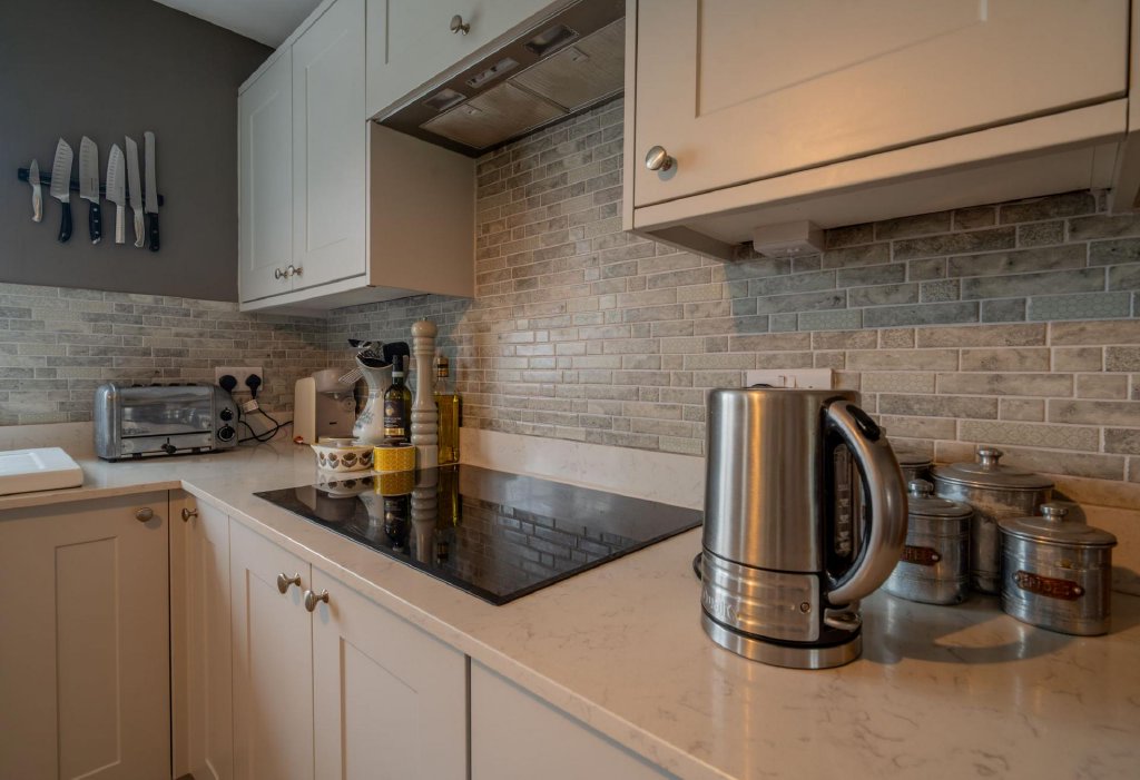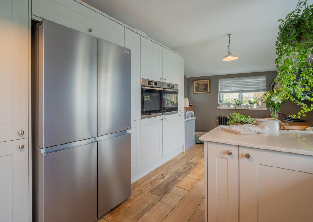 The Living Room is a cosy space with a working fireplace and front-facing windows. The Kitchen and Dining Room form a sociable open-plan space fitted with an induction hob, Belfast sink, Bosch double oven and dishwasher, Hisense American-style fridge freezer, and Quartz worktops. French doors open onto the garden, complemented by two additional windows filling the space with natural light.