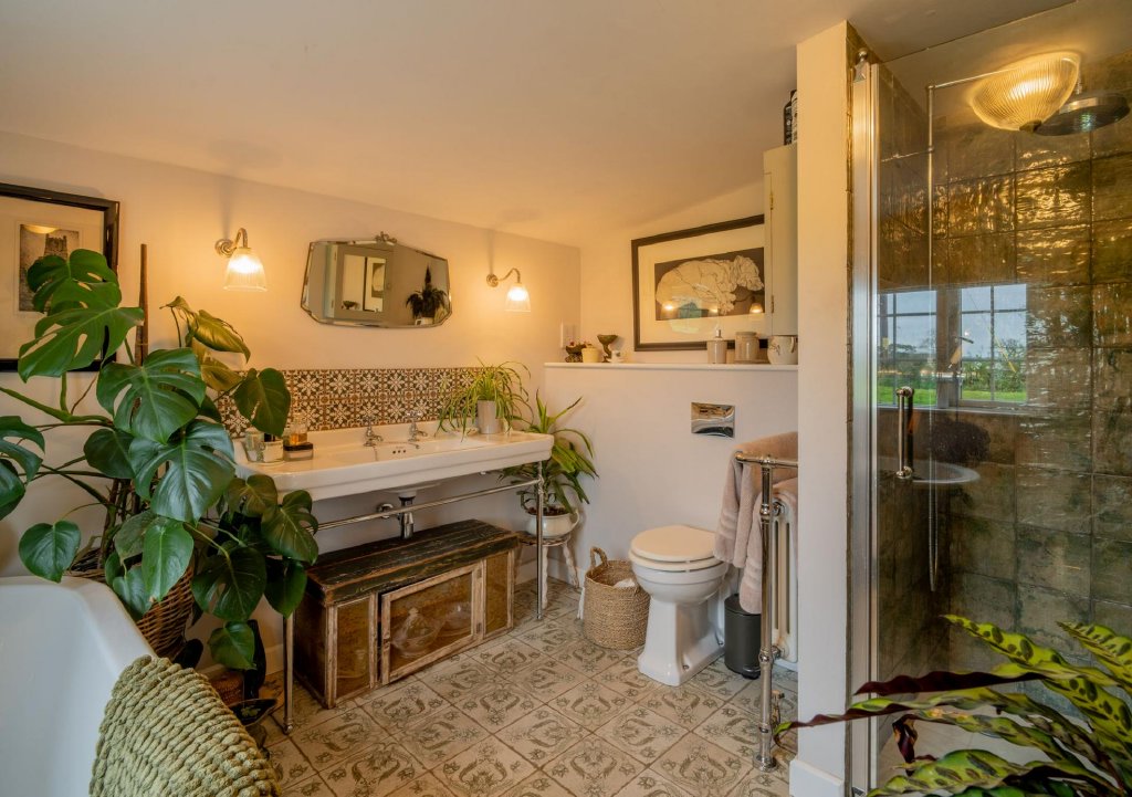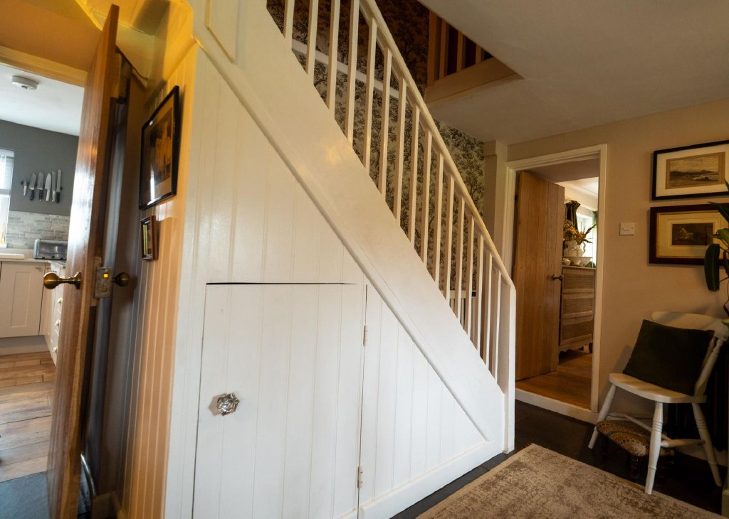 Upstairs, a short staircase leads to the first floor, where you’ll find a Family Bathroom featuring a freestanding bath, walk-in shower, vanity unit, and toilet, all set beneath original exposed beams with loft access above.