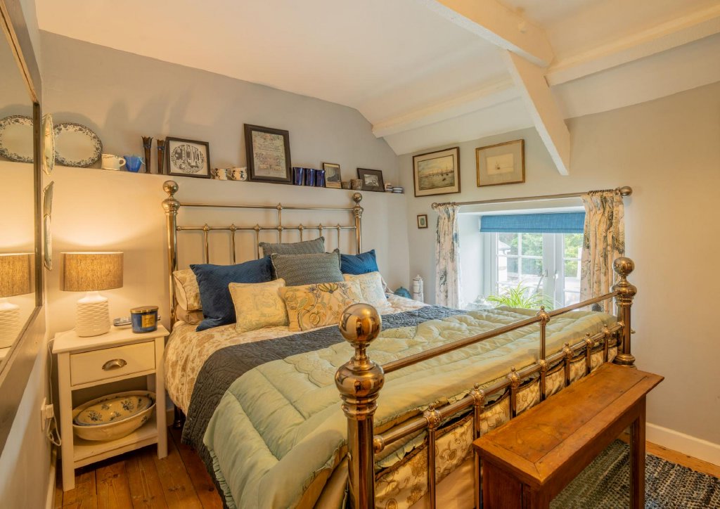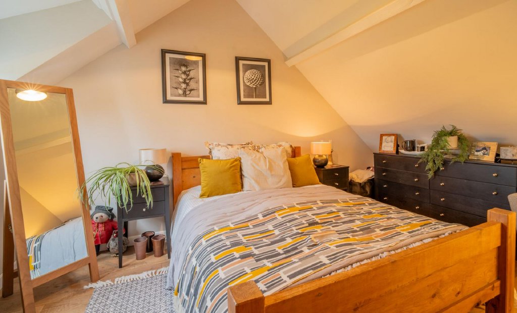 Two further bedrooms offer charm and character, one with exposed beams and high ceilings, both enjoying plenty of natural light. A landing connects all rooms, continuing the cottage’s timeless style.