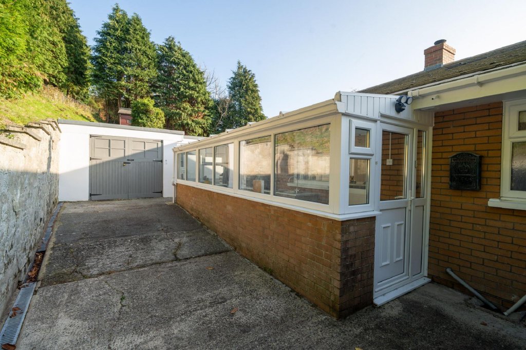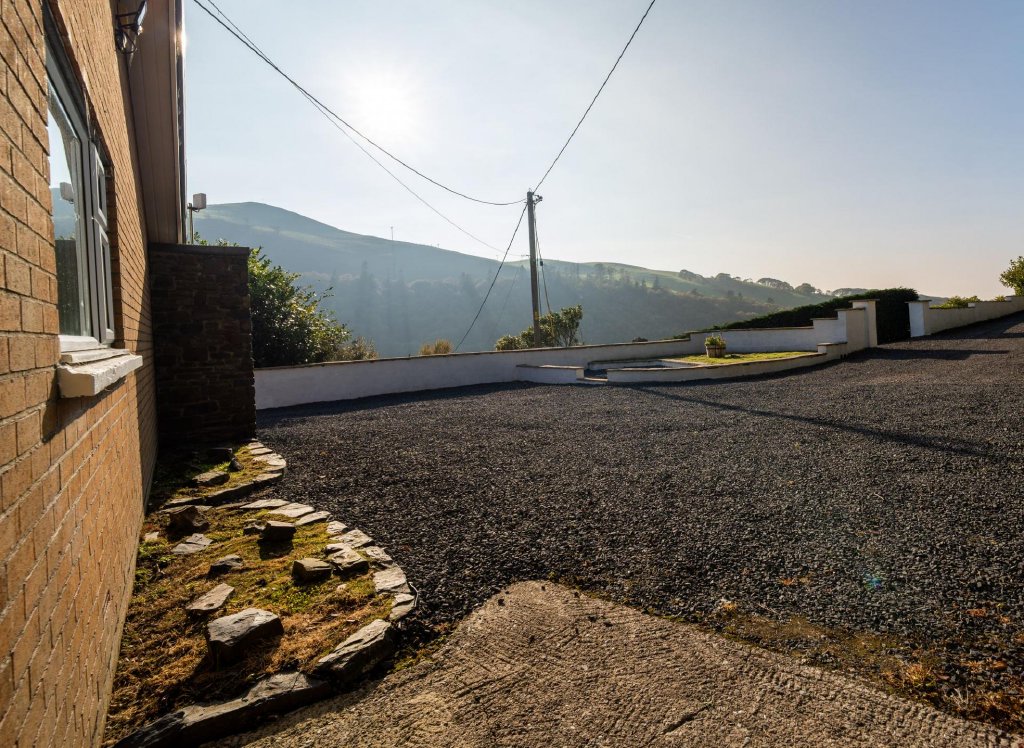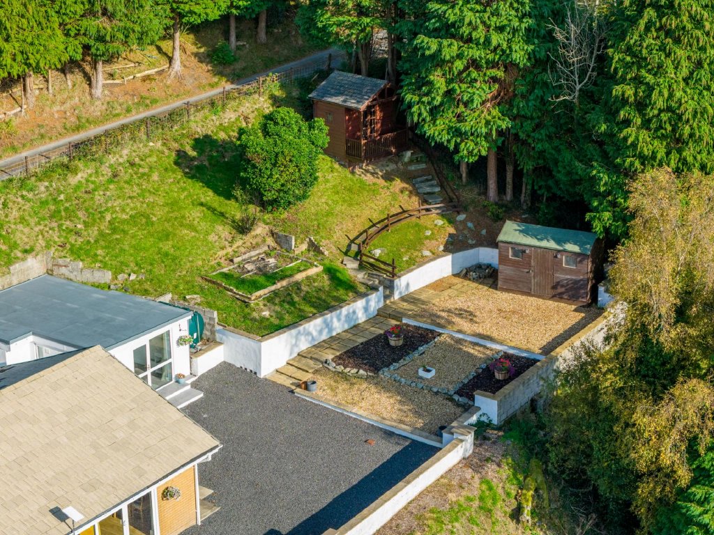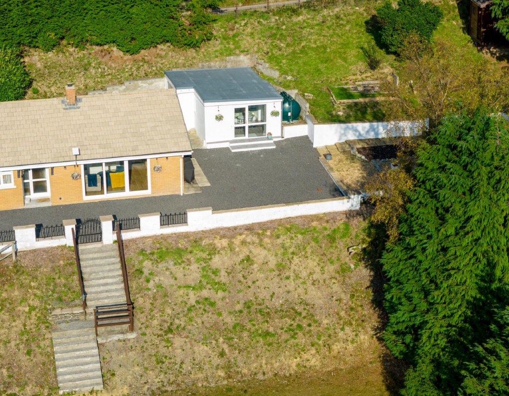 Outside, there is extensive parking for several vehicles to the front, side and rear, attractive landscaped gardens with easy-maintenance borders, a timber shed, oil tank, and an elevated summer house enjoying panoramic rear views. The plot is enclosed by walling and fencing and includes a large front section offering potential for future development (subject to planning consent).