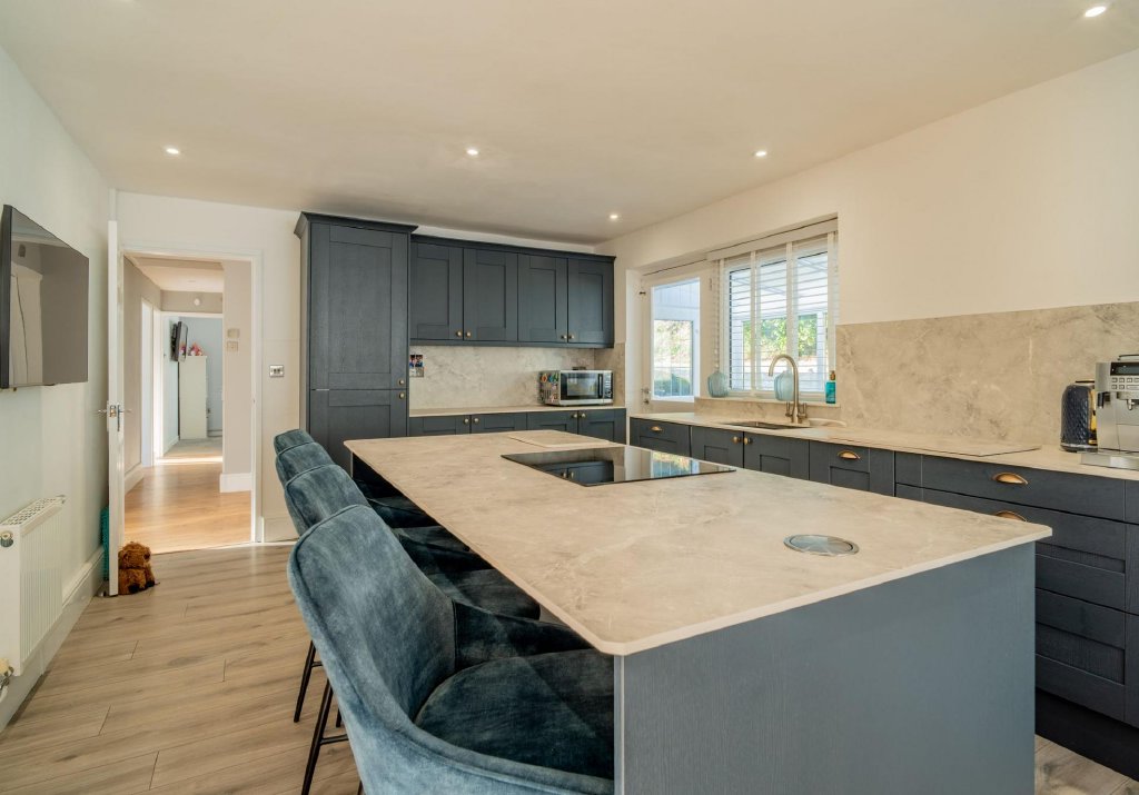 A glazed entrance porch opens into a bright hallway with oak engineered flooring and access to the main reception rooms. The spacious sitting room features sliding patio doors to the front, framing open countryside views, and a contemporary fireplace with matching flooring continuing through to the dining area. The open-plan kitchen/dining room has been refitted to an exceptional standard with an extensive range of units, compact-laminate work surfaces and integrated appliances, creating a sociable space perfect for entertaining. A door leads to a generous utility room with additional storage and access to the garden.