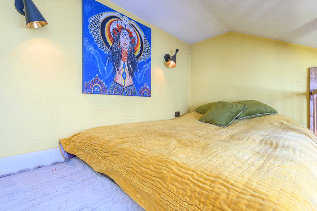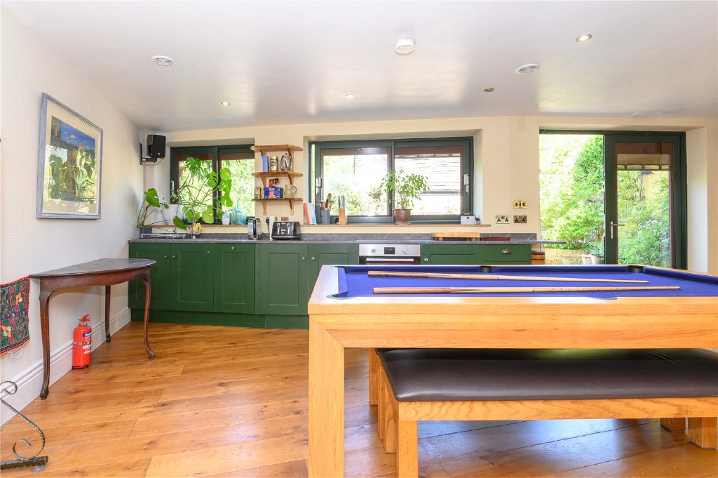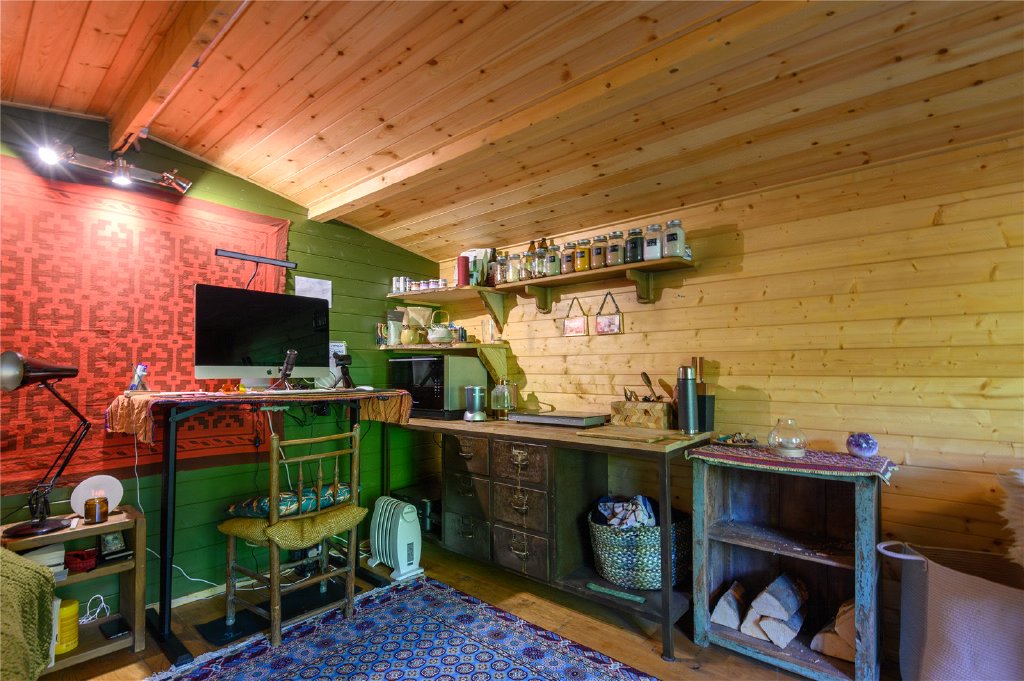 ‘The Cave’ is a spacious, self-contained outbuilding – ideal as a guest suite, home office, or rental studio – with the convienience of underfloor heating and featuring a fully fitted kitchen, shower room, bespoke 4-poster bed and a dining area that cleverly converts into a pool-table space.