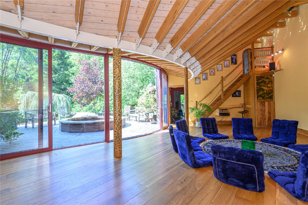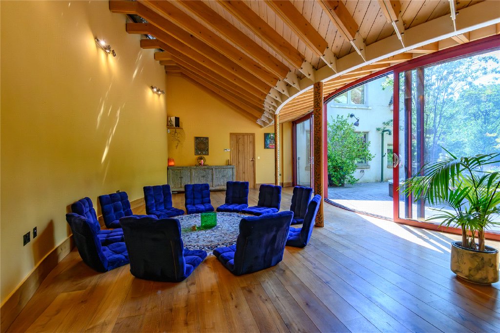 Accessible via a separate entrance, it features a stylish kitchenette with underfloor heating, a sauna and shower room, and a stunning studio or sunroom with curved glass doors that open the space to the woodland beyond – an inspiring setting for yoga, art, or quiet reflection.