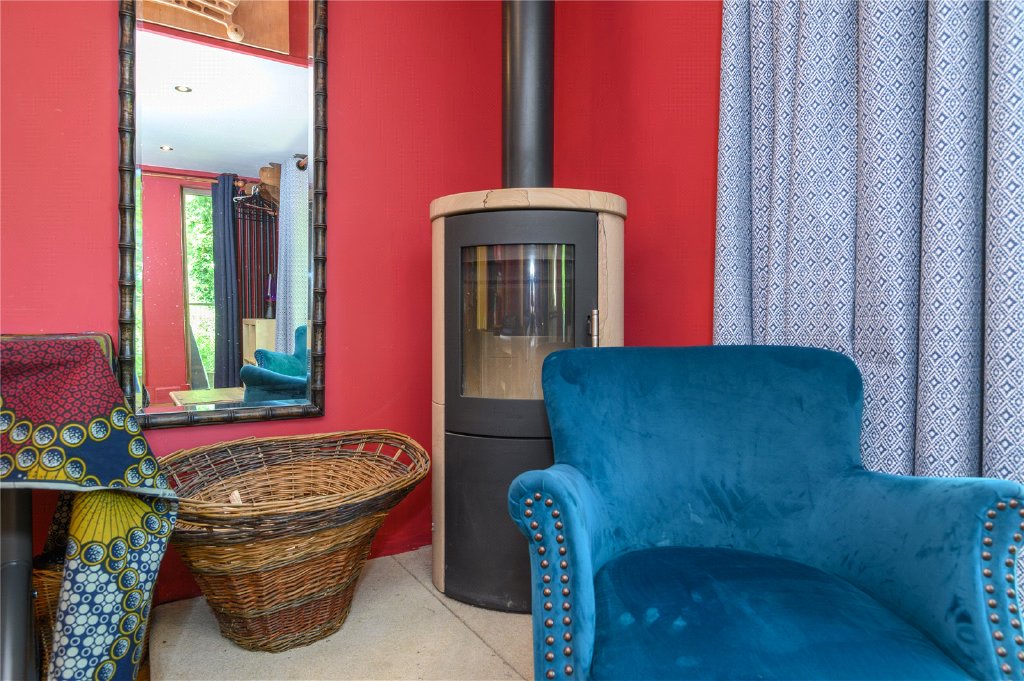 The open-plan kitchen and dining room are a masterclass in simple, handcrafted elegance, featuring a classic Shaws Belfast sink, solid wood cabinetry, and sweeping woodland views through dual-aspect windows. The space allows you to host for large gatherings and the adjoining lounge exudes warmth and intimacy – deep window seats, a second log-burning stove, and mellow timber tones combine to create the perfect retreat for evenings by the fire.