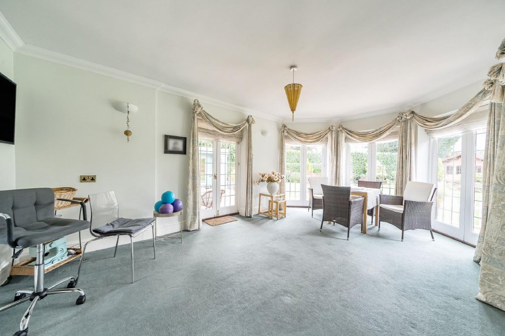 Internally, the property is bright and spacious throughout, with a wide entrance hall featuring wood flooring and providing access to all main rooms. The large double-aspect lounge is a superb reception space, offering both a central fireplace and French doors leading out to a covered rear terrace with views across the beautifully maintained level gardens. A separate dining room, ideal for entertaining, features an attractive picture window framing views of the rear garden.