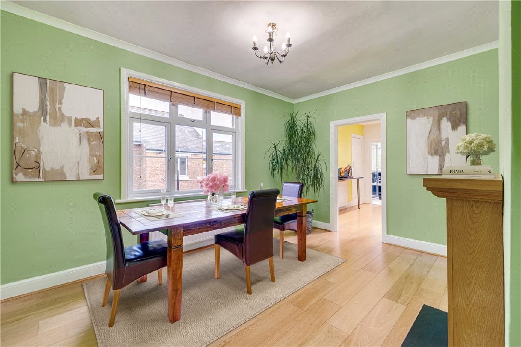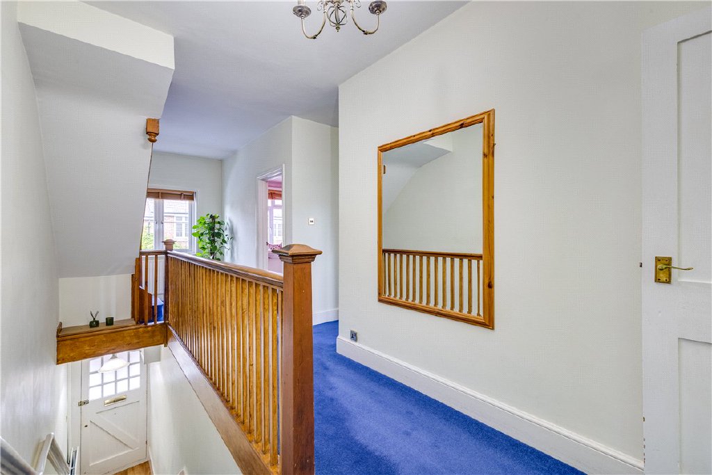 Occupying the first and second floors of a purpose-built maisonette, the home opens into a bright and spacious reception room, currently used as a dining area, that flows seamlessly into a well-equipped kitchen with ample storage and room for a dining table. The garden is accessed directly from the kitchen.