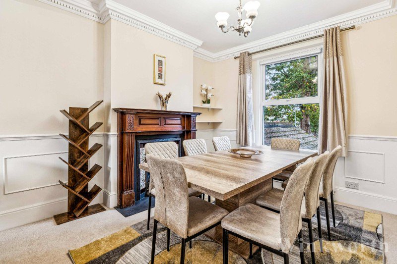 The double reception room on the ground floor is a standout feature, showcasing decorative cornicing, large sash-style windows, and twin fireplaces that highlight the home’s period heritage. Defined lounge and dining areas make it a warm and versatile space for entertaining or relaxing.