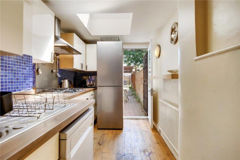 To the rear, the modern galley kitchen combines style and practicality with sleek cabinetry, solid wood worktops, and striking blue metro-style tiles that add a bold touch of character. A skylight fills the room with natural light, and a glazed door opens directly onto the private rear garden, creating a seamless flow between indoor and outdoor living — perfect for morning coffee or summer dining.