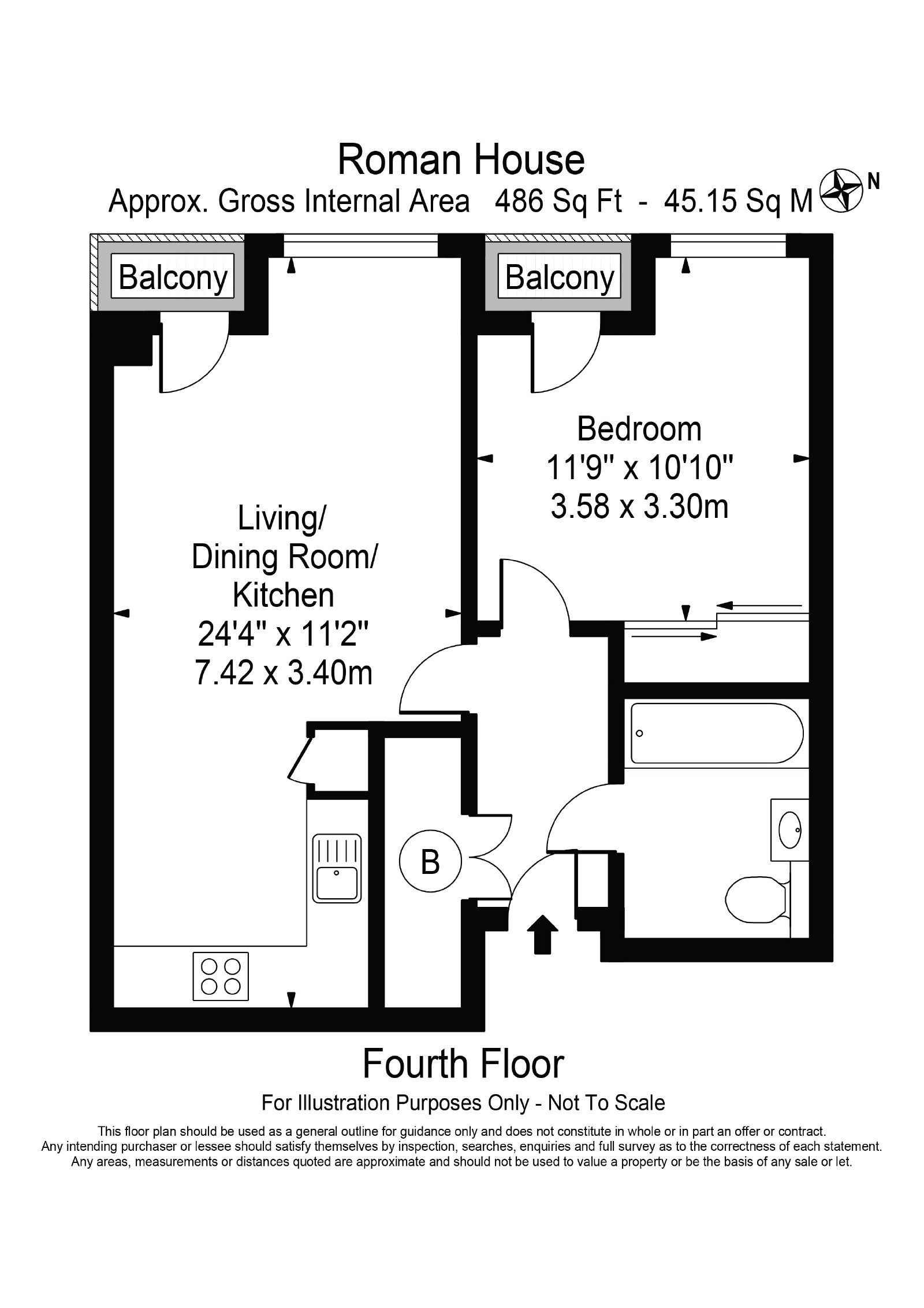 A one bedroom apartment of approximately 489 square feet, situated on the fourth floor of a modern block with lift and concierge.