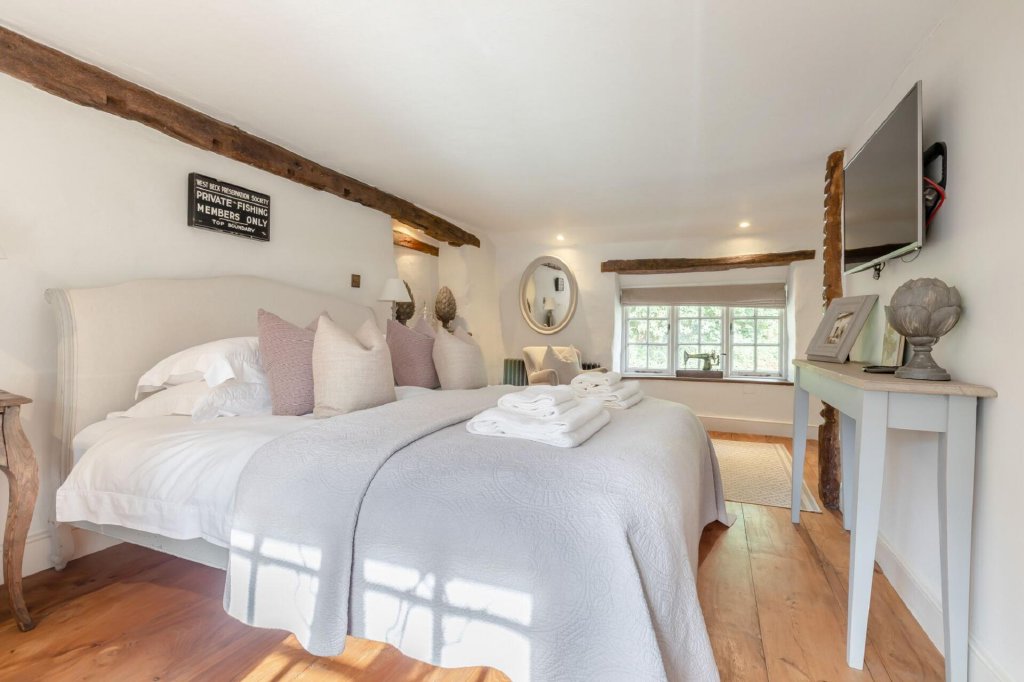 The first-floor landing has beautiful exposed wooden flooring, bathed in natural light from a window positioned at the top of the staircase. The principal bedroom is brimming with character and charm, enjoying a dual aspect that enhances the sense of space and light. It also has gorgeous, exposed Elm wooden flooring and benefits from a luxurious en-suite shower room, fitted with high-end Fired Earth fixtures.