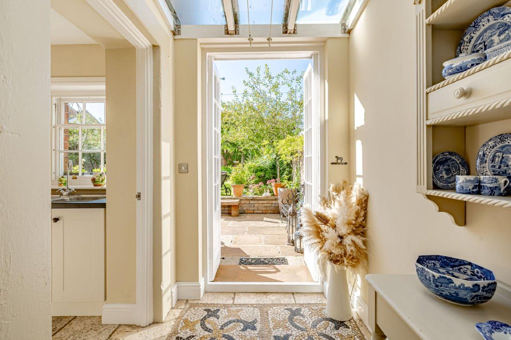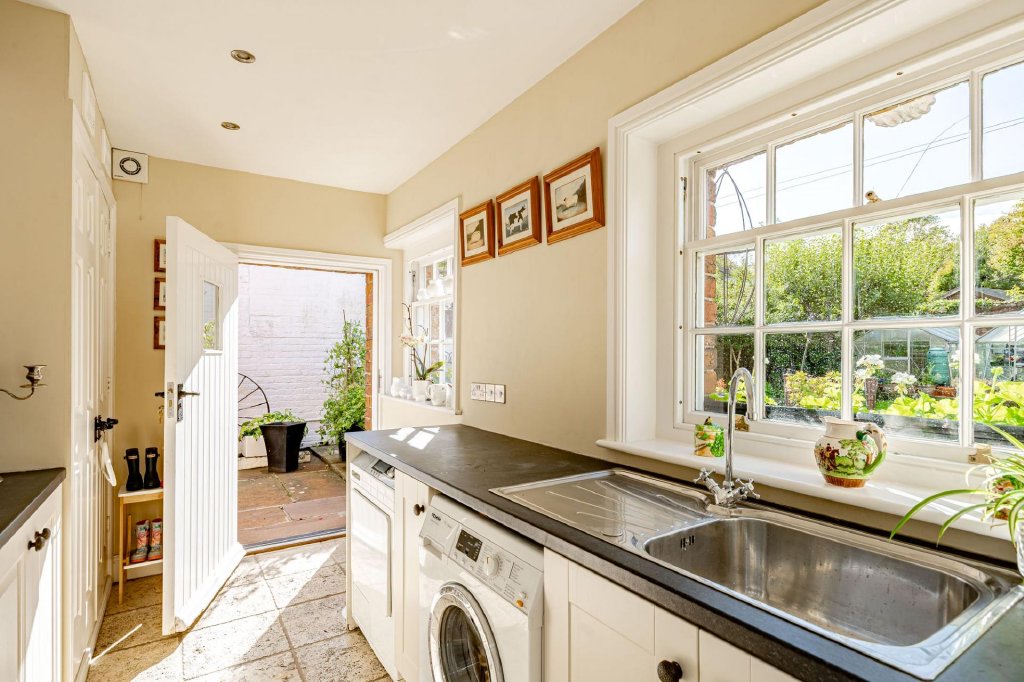The kitchen at the rear of the property is generous with two windows onto the courtyard to the side of the property. There are built-in painted wooden cupboards, an island with a double ring gas burner and quality granite worktops. There is a two-oven gas fired Aga providing hot water, serviced annually and an integrated dishwasher. The floor is a stunning quality travertine tile with underfloor heating; this continues through to the dining area where French doors lead out to the garden. The utility is bright with two windows; it is a generous space with numerous floor and wall mounted cupboards offering ample storage. There is plumbing for white goods, a sink and the boiler is situated here. There is also a back door to the courtyard at the side of the property.