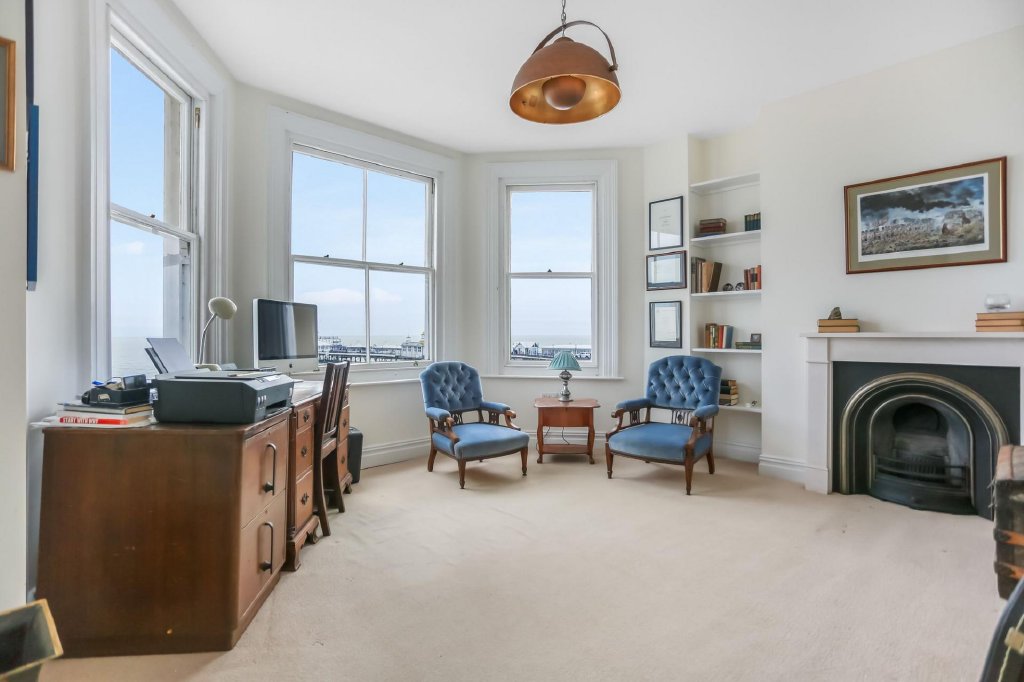 Ascending the staircase with its elegant mahogany balustrade, the first floor reveals a magnificent bay fronted bedroom filled with period character. Adjacent to this is the belvedere, a light filled haven currently used as a sewing room but equally suited to a tranquil home office or retreat. With dual aspect wraparound windows framing panoramic views of the ever-changing tides and Eastbourne Pier, this space is truly spectacular.