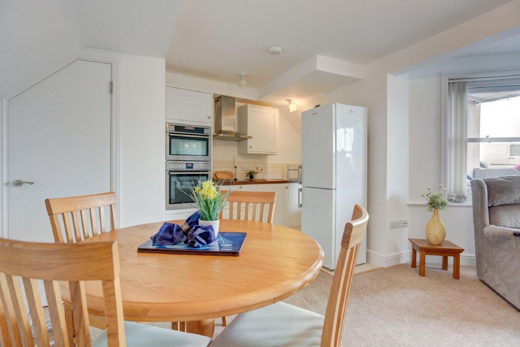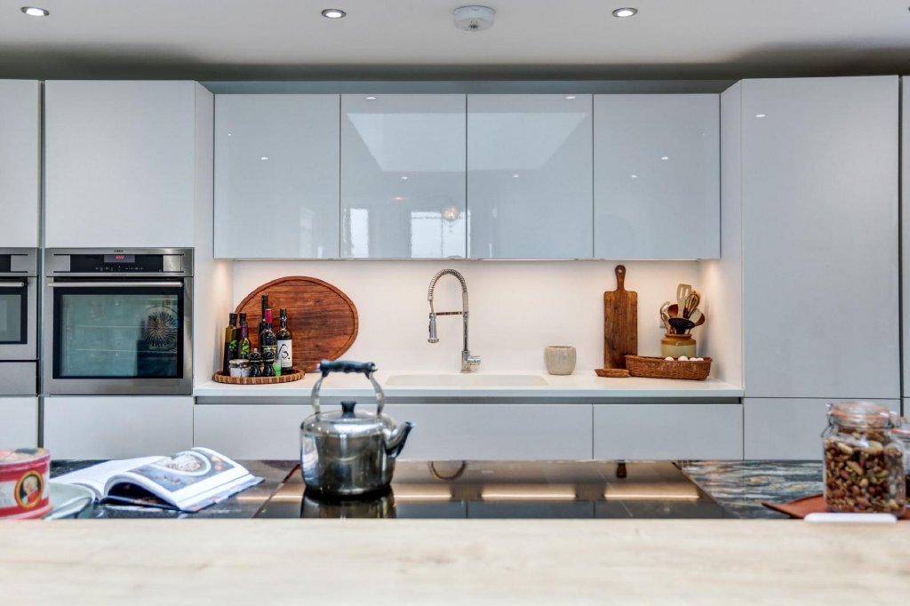 The sleek, white gloss kitchen at the rear is a masterpiece of modern design, with integrated AEG appliances including sous vide oven and a striking central island crafted from granite and wood. Perfect for both casual dining and entertaining, the island is strategically positioned to provide uninterrupted sea views, enhanced by the natural light streaming through a roof lantern above. The state-of-the-art AEG induction hob makes cooking a pleasure in this thoughtfully designed space.