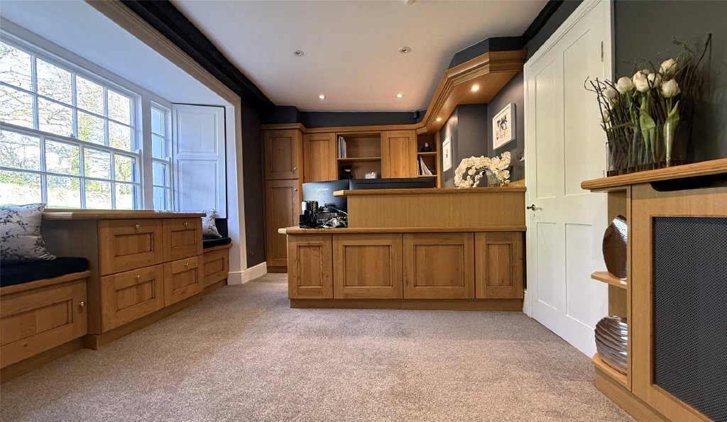 This wing also benefits from its own entrance with porch and a newly fitted kitchen with integrated appliances including an electric oven, induction hob, microwave and dishwasher. Stylish display cabinets and a quality work surface complete the space. As this part of the house is self-contained yet connected, it is ideal for extended family, holiday letting, guests or those looking for independent living within a larger home.