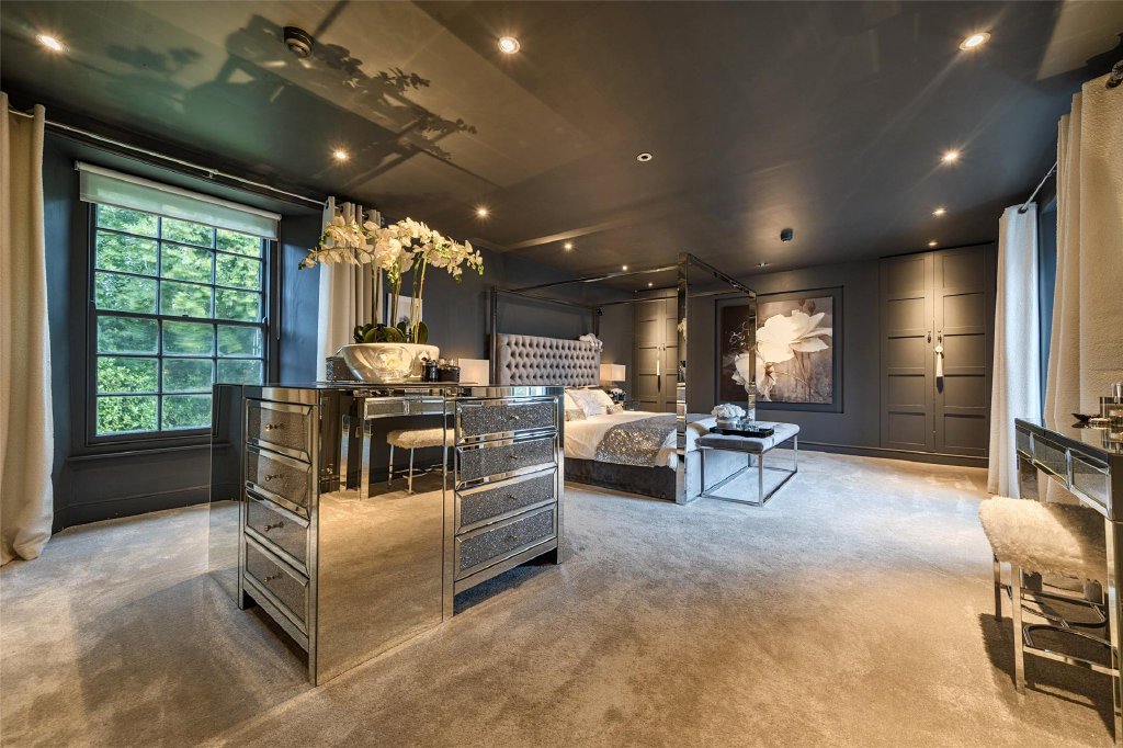 The impressive master suite has a combined floorspace of over 580 sqft comprising a lobby, dressing room, bathroom, walk-in shoe store, and very generous main bedroom which is dual aspect with far reaching views over the Devon countryside. A bold use of colour, beautiful built in wardrobes and WiFi controlled lighting design combined with its location in the eastern wing of the house create a uniquely private and luxurious retreat for the owners of the manor.