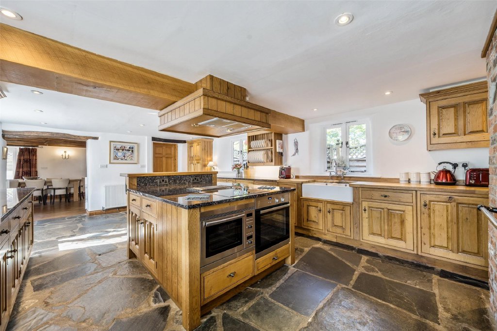 The spacious dining area comfortably accommodates a ten seat dining table and opens directly onto the garden via French doors - perfect for entertaining or relaxed summer evenings. The thoughtfully designed kitchen is a true centrepiece: dual aspect, with handmade solid oak cabinetry, granite worktops, a breakfast bar and a full suite of integrated appliances including electric oven, microwave, two under counter fridges, and dishwasher. A double butler sink and an Alpha range style cooker complete the luxurious, country-inspired feel.