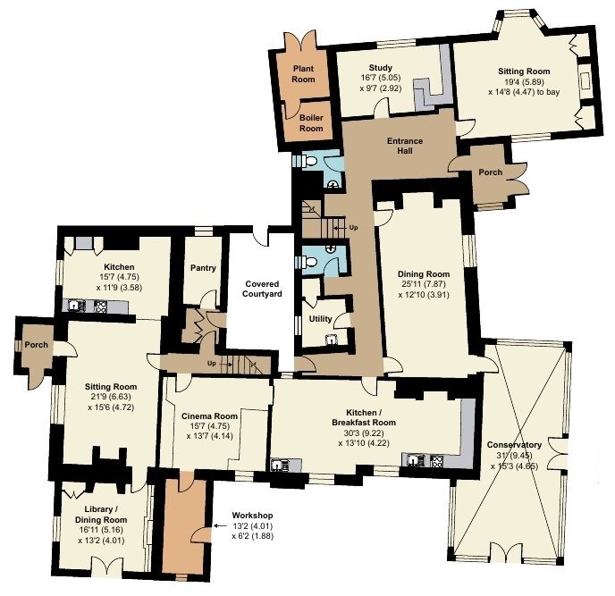 The conservatory wraps around the east and south elevations of the house and is currently used as a gym and sitting room. As a conservatory has been here for many years, it is highly likely the local authority would support an application for a replacement structure as it doesn’t form part of the listing.