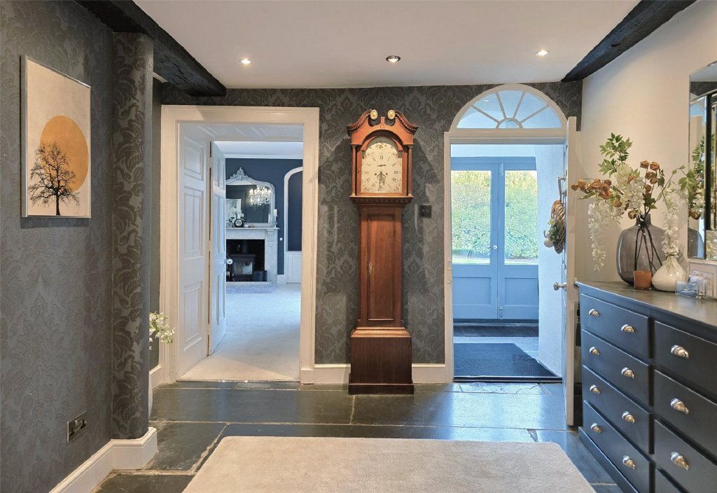 The property is accessed at several points around its perimeter. The formal entrance on the eastern side leads into an inviting hallway, featuring an impressive original slate floor that immediately sets a refined tone.
