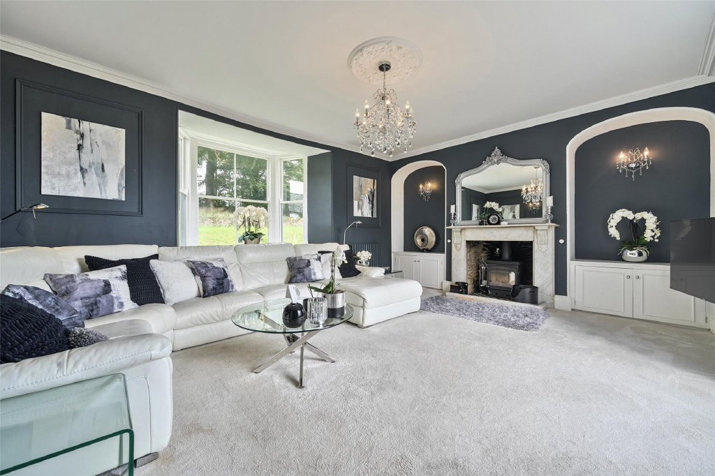 The main sitting room is both bright and welcoming, with dual aspect windows, including a bay and a large sash window, offering lovely views over the grounds. A striking polished marble fireplace with an inset wood burning stove creates a beautiful focal point. Built-in cupboards provide additional storage.
