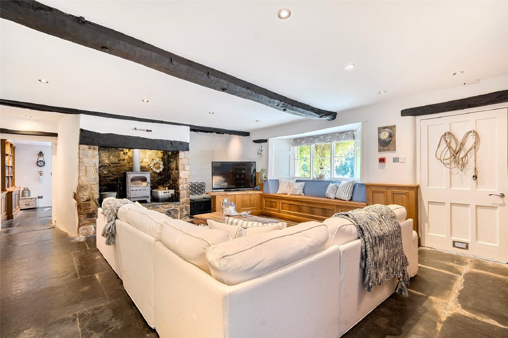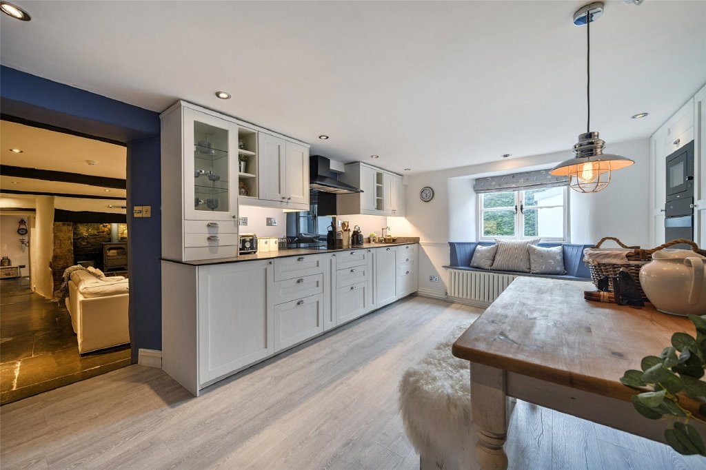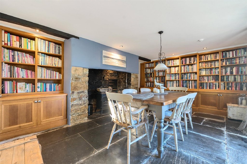 In the historic west wing of the house, two further reception rooms provide both atmosphere and character. The sitting room features a superb slate floor, an inglenook stone fireplace with an inset wood burning stove, a window seat, huge original hand crafted beams and an historic slate scald creamery. Bespoke oak carpentry includes built-in shelving, cupboards and radiator covers.