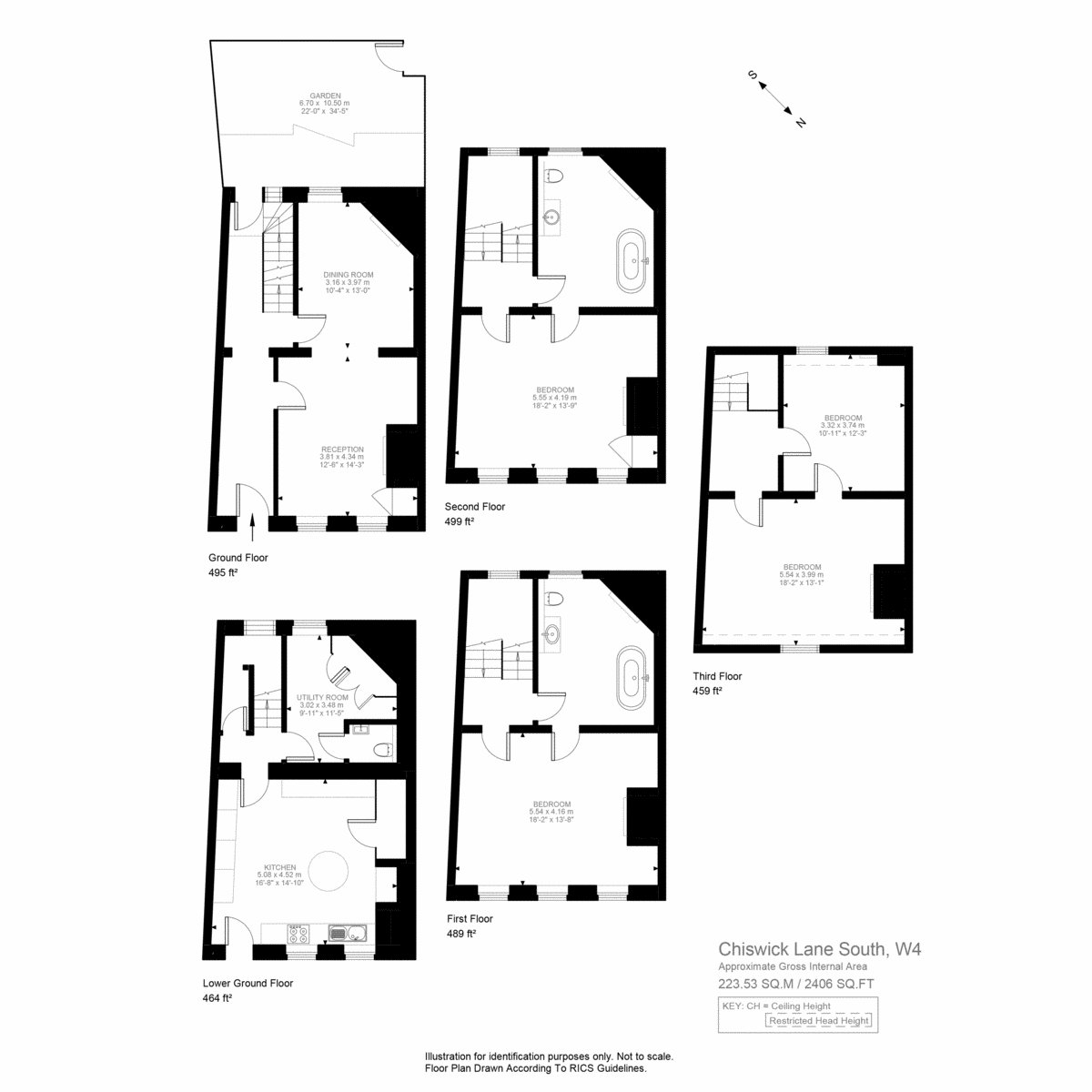 The upper two floors accommodate four exceptionally generous double bedrooms, each enjoying serene, leafy views over Homefield Recreation Ground South. The residences are served by two exquisite bathrooms, each featuring luxurious freestanding baths, combining comfort with classic style.