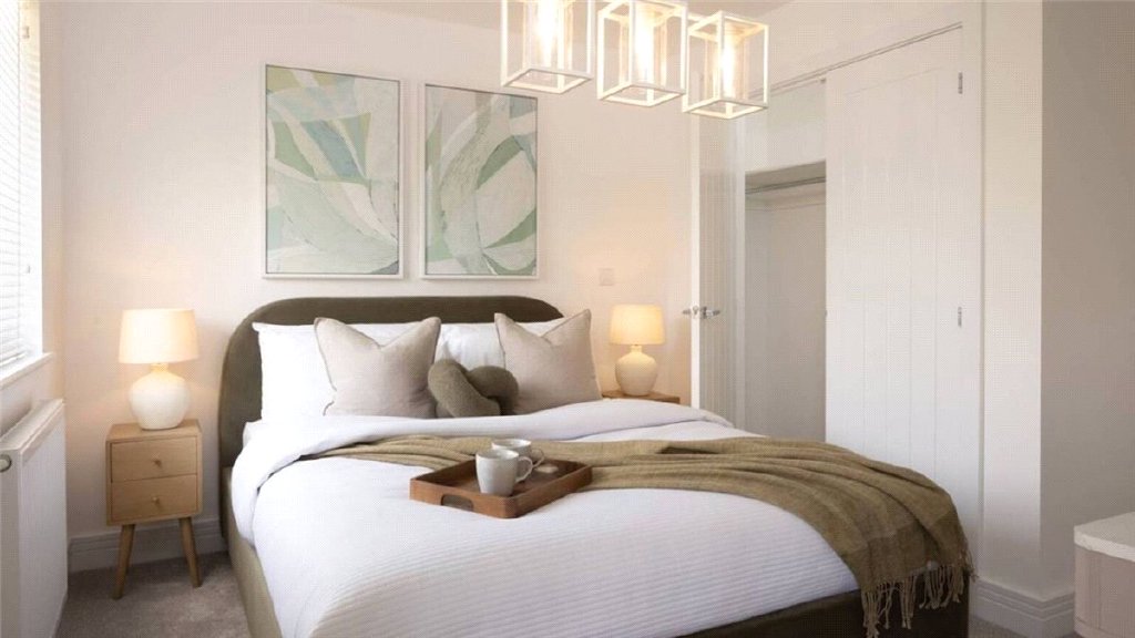 The apartment features two generously sized bedrooms, with the principal benefiting from a fitted wardrobe for added convenience. The second bedroom is a comfortable double, and both share a contemporary family bathroom fitted with white Roca sanitaryware and a bath with shower over. Two useful storage cupboards complete the home.