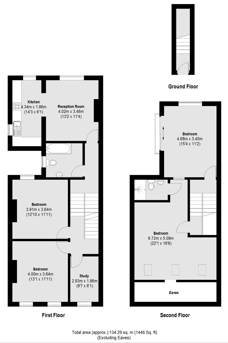 A spacious and beautifully presented four double bedroom maisonette set over the first floor of this handsome building with a footprint that extends to approx 1,446 comprising a spacious front reception room, a large eat-in kitchen, four bedrooms, a study and two bathrooms.