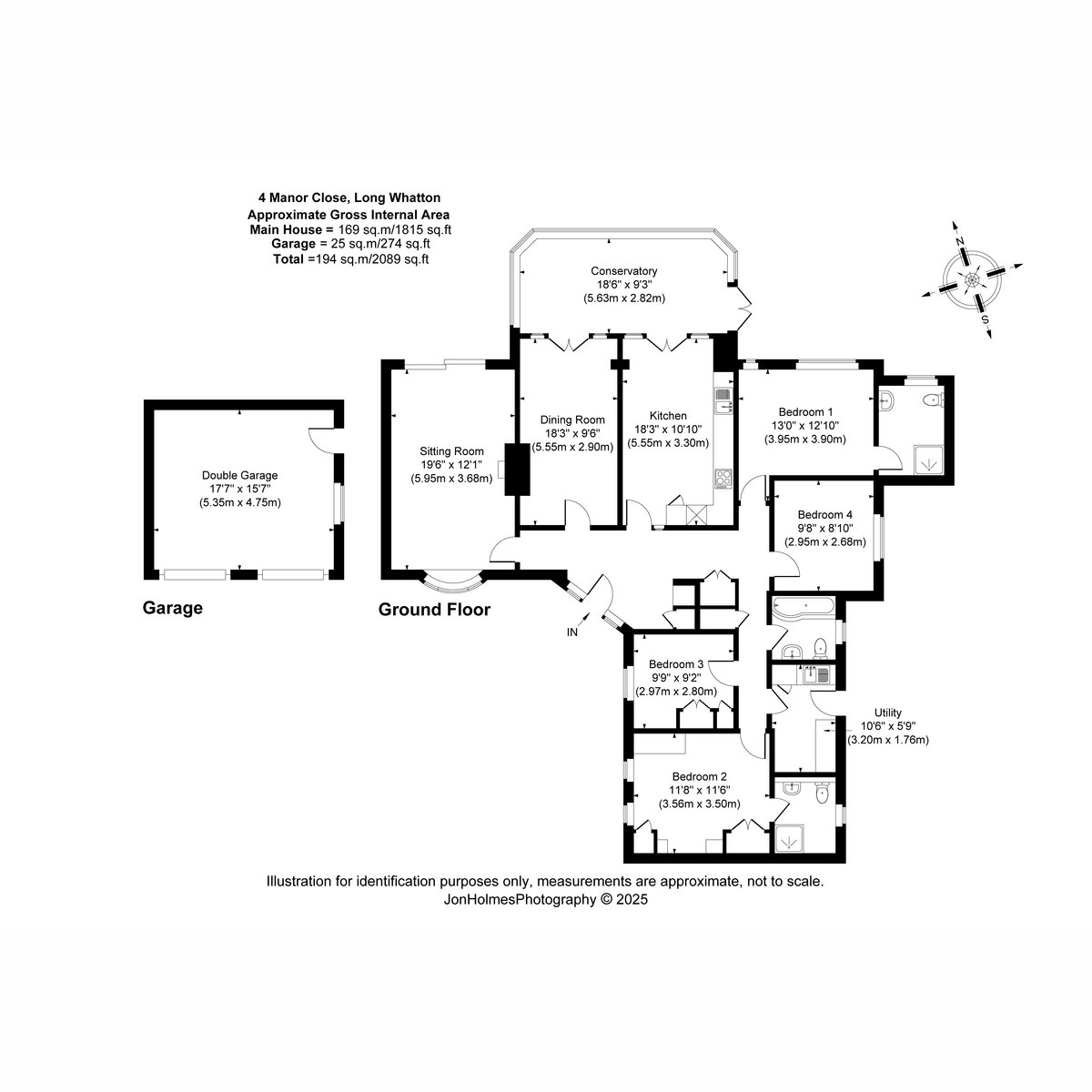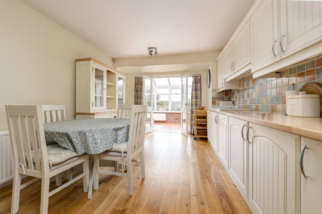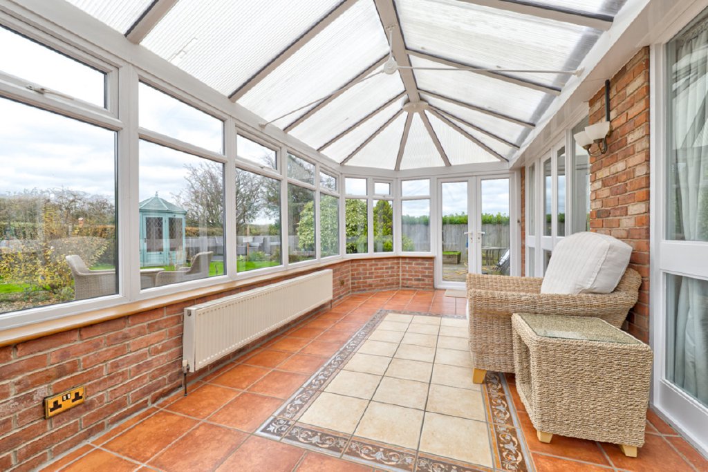 The property is entered via a spacious hallway featuring useful storage cupboards. The sitting room enjoys a dual aspect, with patio doors opening to the rear garden and a fireplace with an open grate providing a welcoming focal point. Both the dining room and kitchen open through double doors into a large uPVC conservatory, creating a wonderful flow of natural light throughout the living spaces. The kitchen, with ample room for dining, is fully fitted with a comprehensive range of cabinets, a matching dresser unit, and integrated appliances. The conservatory offers panoramic views across the garden and the open countryside beyond. From the hallway, a long inner corridor leads to four bedrooms, the family bathroom, and a fully equipped utility room. Bedroom one overlooks the rear garden and benefits from a recently added extension housing a stylish ensuite shower room with a vaulted ceiling. Bedroom two also features its own ensuite shower room.