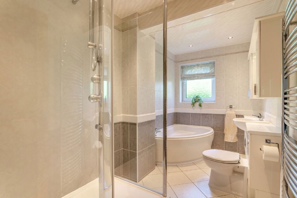 The family bathroom is presented with a four piece suite finished in white consisting of a shower with a curved glass screen and body jets, a corner bath and a vanity unit incorporating both a wash hand basin and a W.C; the room having complementary tiling to the walls and floor, a window and a heated chrome towel radiator.