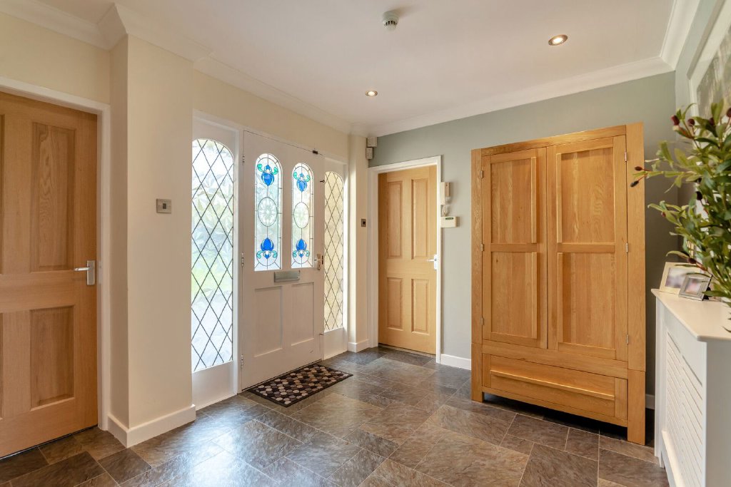 An entrance door with full height windows to either side opens directly into the reception hall.