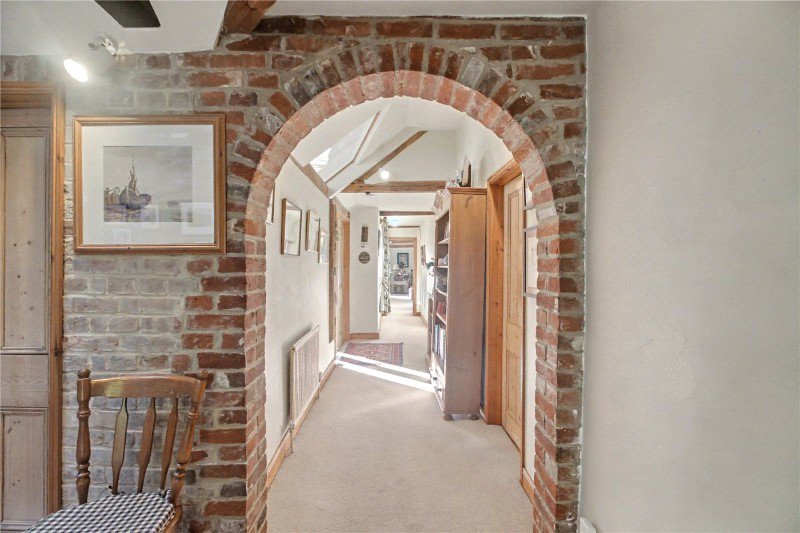 Inside, the sense of space and character is unmistakable. A useful porch opens into a grand hallway that instantly showcases the scale of the home, a statement entrance large enough to function as a versatile reception area. The barn extends to around 2500 SQ.FT and incorporates the features buyers expect from a period property of this calibre, including vaulted ceilings, exposed beams, original doors and sections of exposed brickwork that add warmth and texture throughout. All four bedrooms are doubles, with the principal bedroom enjoying a modern ensuite, while the remaining rooms are served by a family bathroom and an additional cloakroom.
