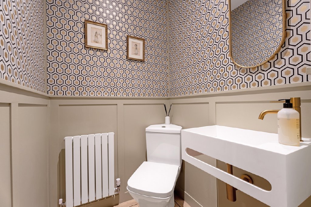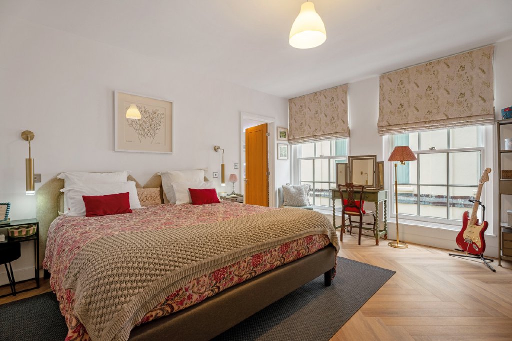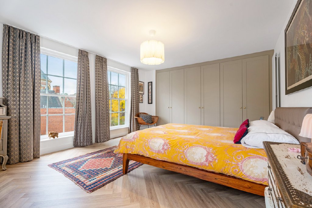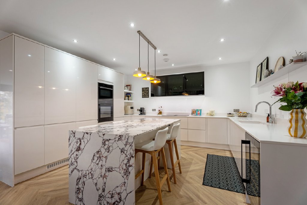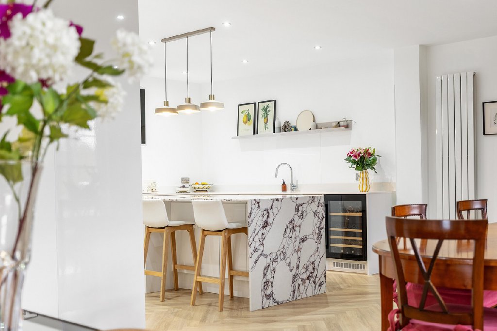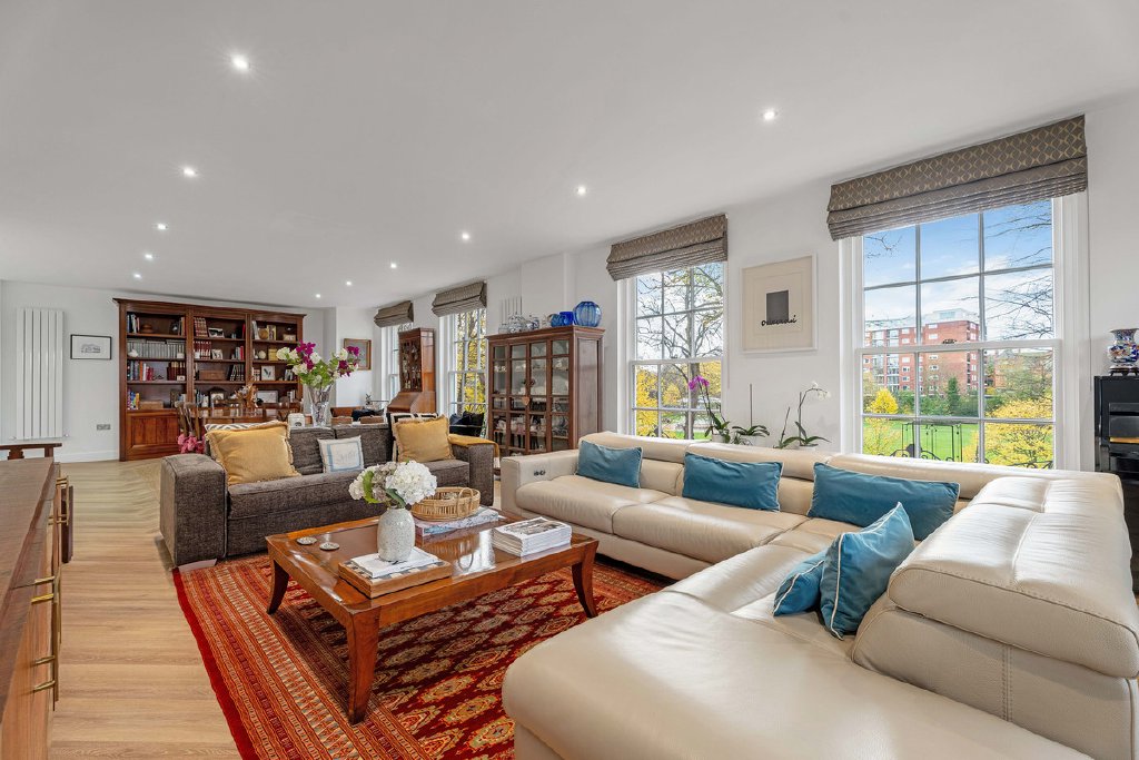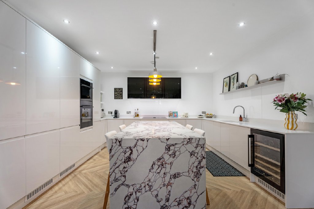 The spacious open plan living area is flooded with light from large, dual aspect, sash windows offering views over the Pump room gardens to the River Leam. The stunning high gloss, handleless kitchen features a large Swinsons quartz central island with seating for four, Nile Calacatta Viola Worktops, and all the integrated appliances you would expect from a modern family kitchen, including Neff oven, Siemens induction hob, integrated dishwasher, fridge freezer and wine fridge.